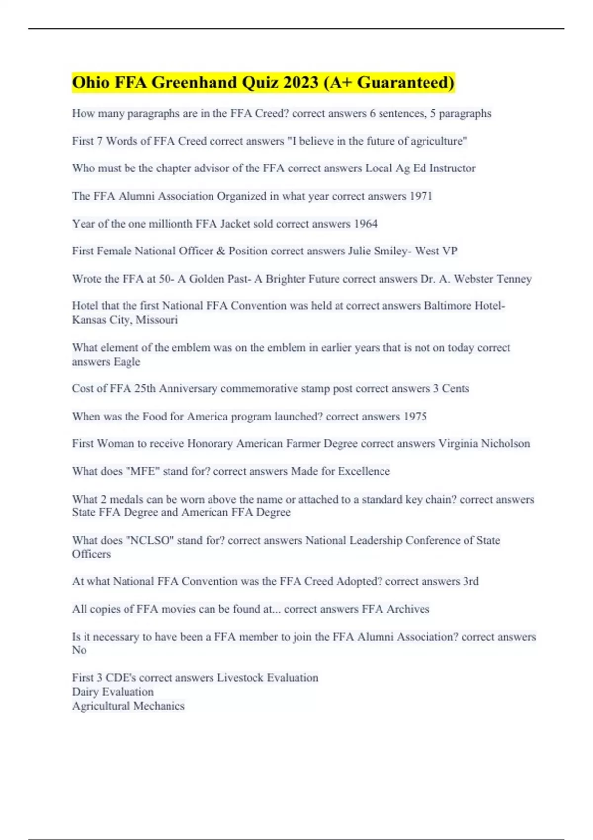 Ohio FFA Greenhand Quiz 2023 (A+ Guaranteed)