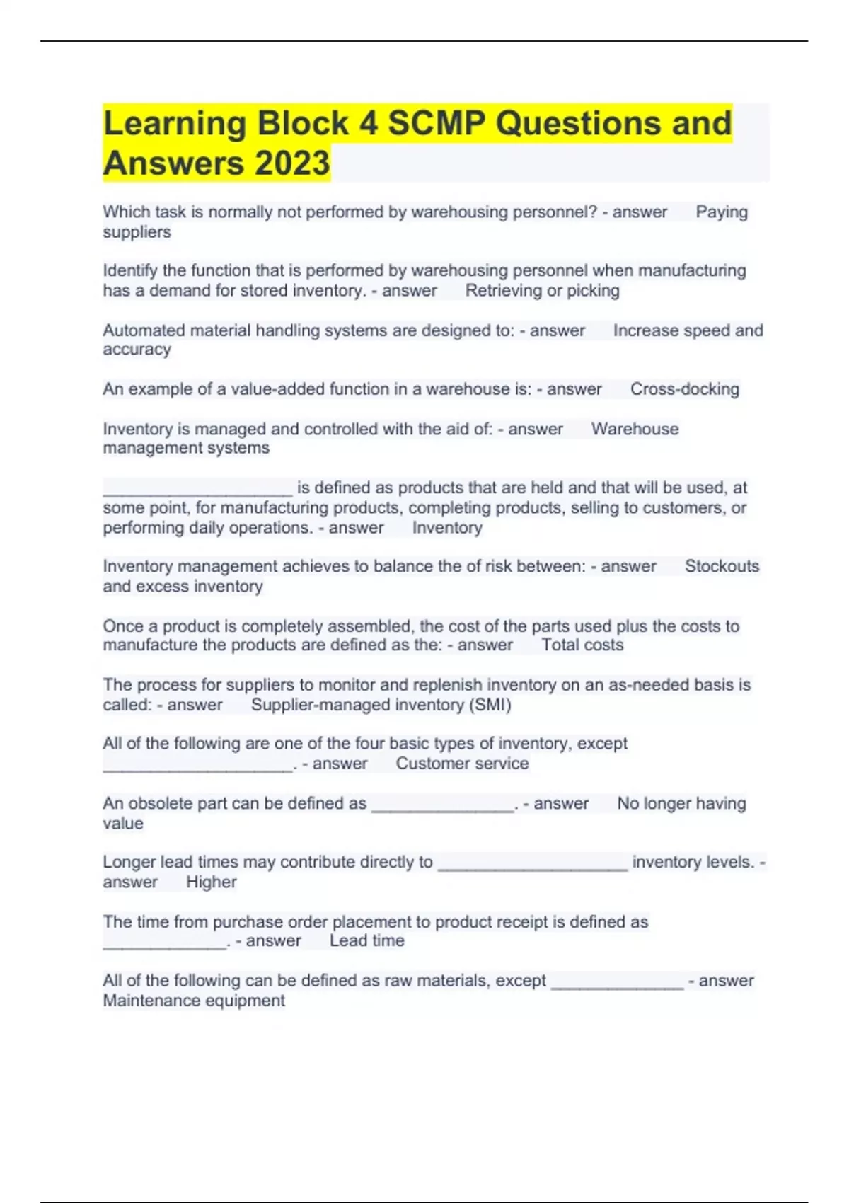 Learning Block 4 SCMP Questions and Answers 2023 Which task is normally not performed by warehousing personnel? Paying suppliers Identify the function that is performed by warehousing personnel when manufacturing has a demand for stored inventory. Retrieving or picking Automated material handling systems are designed to: Increase speed and accuracy An example of a value-added function in a warehouse is: Cross-docking Inventory is managed and controlled with the aid of: Warehouse management systems ____________________ is defined as products that are held and that will be used, at some point, for manufacturing products, completing products, selling to customers, or performing daily operations. Inventory Inventory management achieves to balance the of risk between: Stockouts and excess inventory Once a product is completely assembled, the cost of the parts used plus the costs to manufacture the products are defined as the: Total costs The process for suppliers to monitor and replenish inventory on an as-needed basis is called: Supplier-managed inventory (SMI) All of the following are one of the four basic types of inventory, except ____________________. Customer service An obsolete part can be defined as _______________. No longer having value Longer lead times may contribute directly to ____________________ inventory levels. Higher The time from purchase order placement to product receipt is defined as _____________. Lead time All of the following can be defined as raw materials, except ______________ Maintenance equipment What best describes how often products are used and replaced in a given time period? Inventory turns