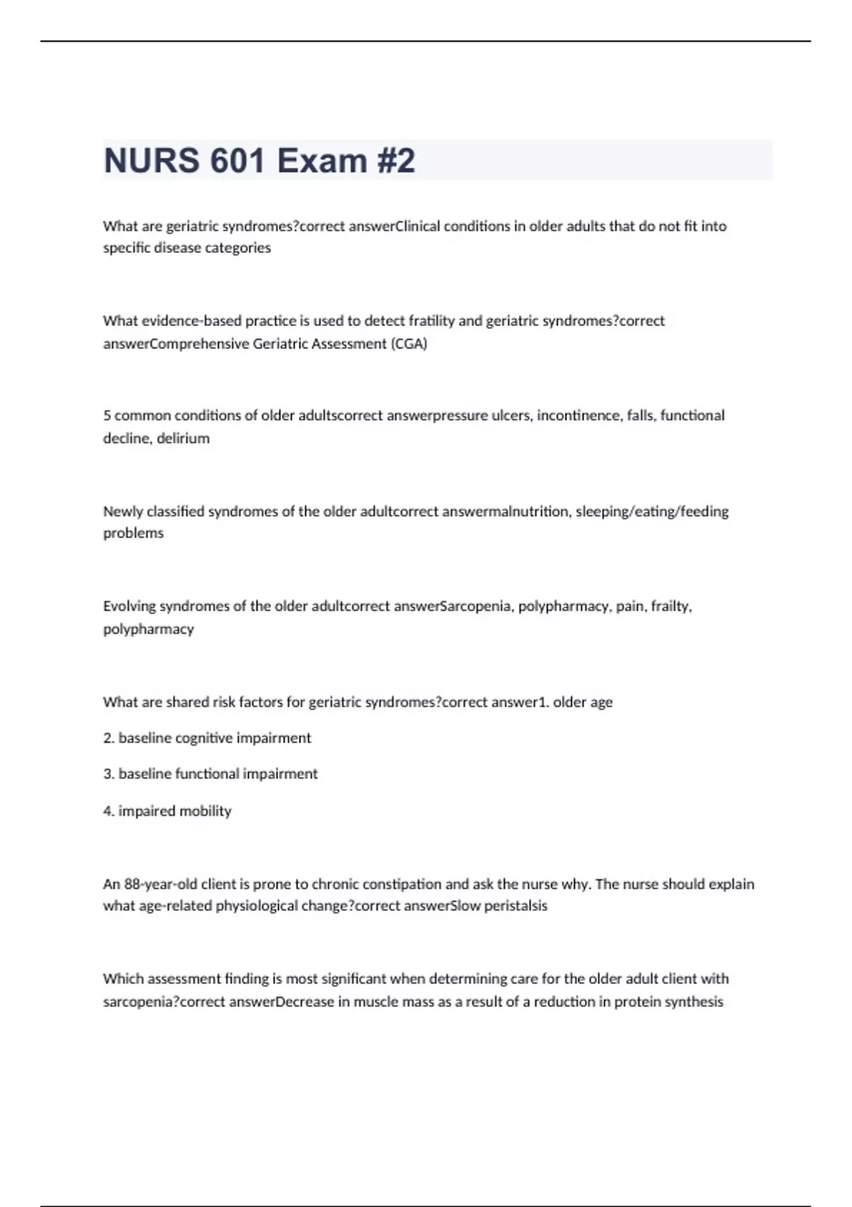 What are geriatric syndromes? Clinical conditions in older adults that do not fit into specific disease categories What evidence-based practice is used to detect fratility and geriatric syndromes? Comprehensive Geriatric Assessment (CGA) 5 common conditions of older adults pressure ulcers, incontinence, falls, functional decline, delirium Newly classified syndromes of the older adult malnutrition, sleeping/eating/feeding problems Evolving syndromes of the older adult Sarcopenia, polypharmacy, pain, frailty, polypharmacy What are shared risk factors for geriatric syndromes? 1. older age 2. baseline cognitive impairment 3. baseline functional impairment 4. impaired mobility An 88-year-old client is prone to chronic constipation and ask the nurse why. The nurse should explain what age-related physiological change? Slow peristalsis Which assessment finding is most significant when determining care for the older adult client with sarcopenia? Decrease in muscle mass as a result of a reduction in protein synthesis An older adult client admits to experiencing urinary incontinence. Which question will the nurse ask first? "When did it start?" Which of the following was not listed in the article about geriatric syndromes (O'Hara, 2014) as being among the five most common conditions? Sarcopenia Which teaching will the nurse include in a urinary health promotion webinar for aging clients? Adequate fluid intake Following a prolonged hospital stay, an older adult client has returned to the nursing home where the client normally resides. The client became incontinent of urine during the time in the hospital, a problem that nursing staff wish to now resolve. What action will the caregivers take in performing continence training? Assist the client with toileting at timed intervals throughout the day. The nurse manager notes a reduction in the number of urinary tract infections being diagnosed in older adult clients. Which unit-based protocol likely contributed to this outcome? Cranberry juice with breakfast The nurse notes that an older adult client has a 2 cm x 2 cm area of redness at the top of the buttocks after sitting in a chair for 30 minutes. What action will the nurse take? Change the client's position. The nurse reviews an older adult client's urinary symptoms. Which statement by the client requires follow up by the nurse? "I have trouble making it to the restroom on time." In chapter six of Leland's (2018) book, he descibes the health expereince of one of the edlers spending "sixty-four days in the hospital or rehab for low blood pressure". Which elder was he talking about? Fred A nurse is teaching older adults at a senior center how to reduce the incidence of falls. Which statement indicates that the nurse's teaching has been effective? "Both over-the-counter and prescription medications can cause me to fall." An 85-year-old client with limited mobility is incontinent of urine. An expected outcome identified on the plan of care is that the client will maintain skin integrity. Which intervention would the nurse most likely implement? Assess the client for wetness every 2 hours. The nurse is caring for an older adult client who is prone to developing constipation. The client asks; "What can I do to prevent this from happening?" Which recommendation(s) will the nurse make? Select all that apply. "Increase the amount of water you drink each day." "Get exercise each day." "Instill a saline enema each night before bed." "Take an over-the-counter laxative each day." "Eat more fruits and vegetables." "Increase the amount of water you drink each day." "Get exercise each day." "Eat more fruits and vegetables." The nurse is reviewing lifestyle changes with an older adult client to support urinary continence. Which statement by the client requires further follow up by the nurse? "I will stay at home to ensure that I can remain close to the toilet." An older adult woman is one day postoperative from a total knee replacement. The client rings the call light to report pain. Which consideration will the nurse prioritize when choosing an appropriate intervention? The need to provide prompt, adequate relief of the client's pain. The film Alive Inside is a documentary about the therapuetic benefits of music and it's power to awaken memories in people with dementia. True A nurse is facilitating a group consisting of family members of older adults recently diagnosed with Alzheimer's disease. One of the family members asks the nurse, "What causes this disease?" Which information would the nurse include? "Alzheimer's disease appears to result from a combination of genetic and environmental factors." A nurse is providing ongoing care for an older adult client with a diagnosis of dementia. Which nursing goal will the nurse prioritize when conducting ongoing assessment of this client? Identify factors affecting the client's functioning and quality of life. A nurse is assessing several older adult clients. The nurse determines which client is experiencing a health problem characterized as delirium rather than dementia? An older adult client experiencing forgetfulness and confusion over the last 48 hours. A client reports symptoms associated with depression. The nurse provides education concerning the effect certain medications have on triggering or worsening depression. What statement by the client demonstrates an understanding of that education? "I am going to ask my health care provider about prescribing something other than a beta-blocker for my hypertension." A nurse is preparing to administer an antidepressant medication to an older adult client with depression. Which information would the nurse need to keep in mind? Side effects that can occur in older adults are likely to be significant. Which modified communication technique will facilitate activity for the older adult client with dementia? simple sentences that contain only one idea The nurse is educating an older adult client about depression onset in later li