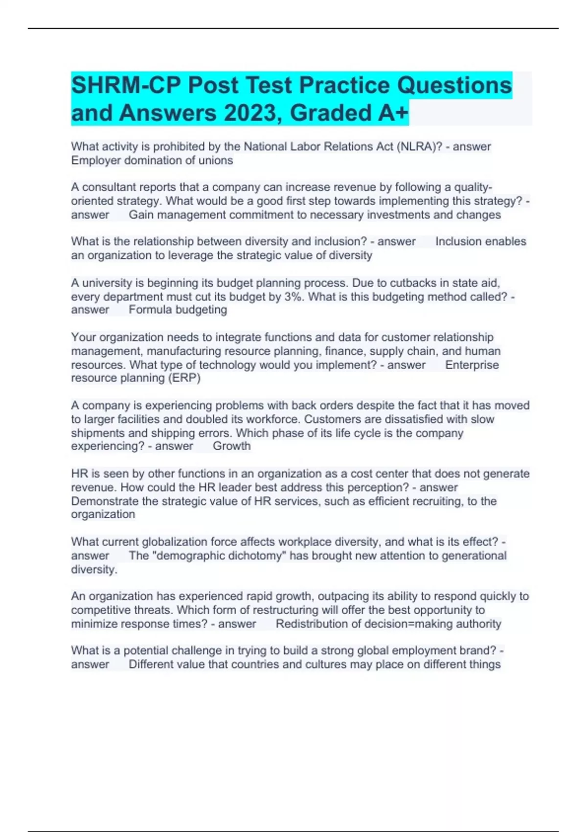SHRM-CP Post Test Practice Questions and Answers 2023, Graded A+