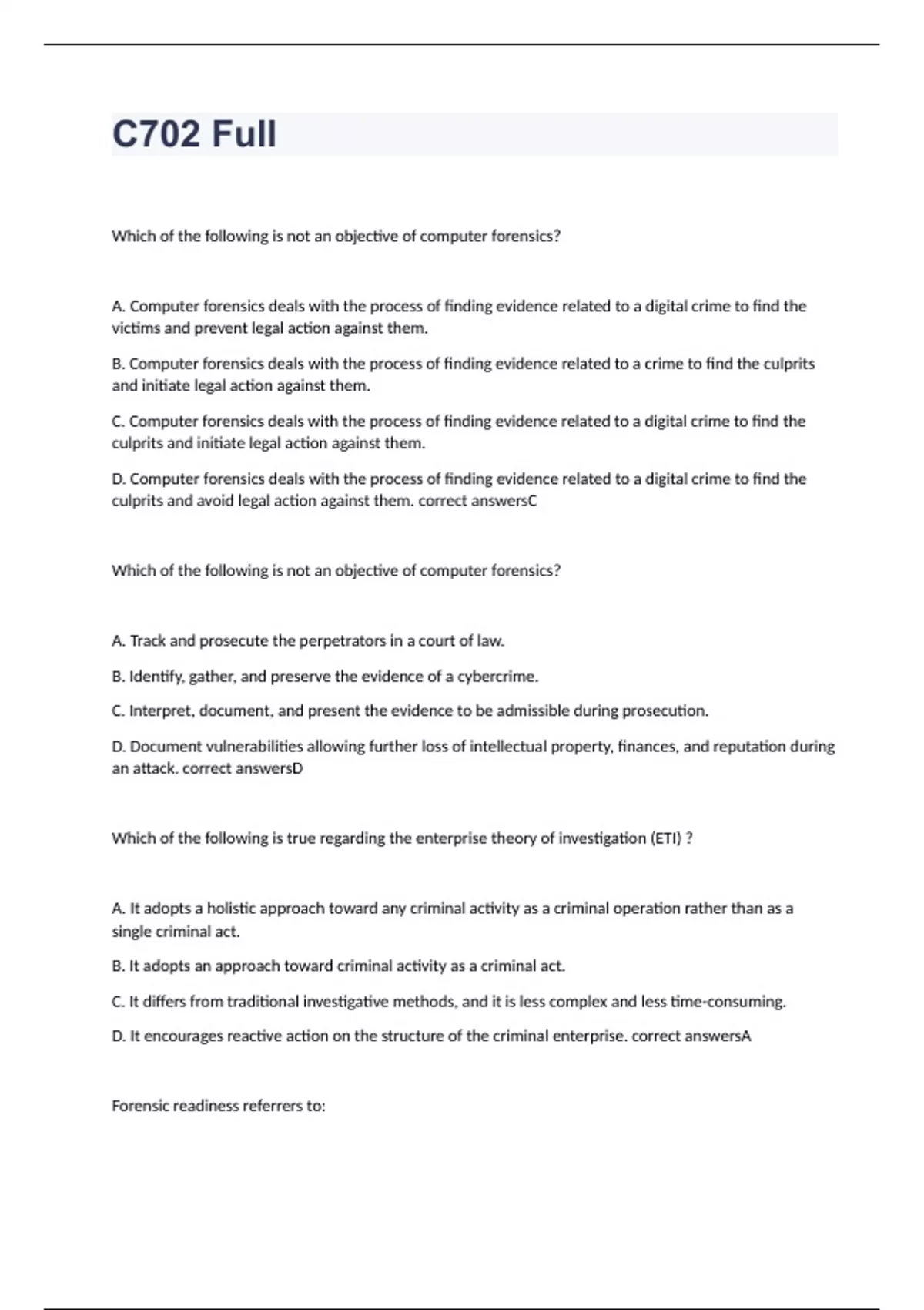 Which of the following is not an objective of computer forensics? A. Computer forensics deals with the process of finding evidence related to a digital crime to find the victims and prevent legal action against them. B. Computer forensics deals with the process of finding evidence related to a crime to find the culprits and initiate legal action against them. C. Computer forensics deals with the process of finding evidence related to a digital crime to find the culprits and initiate legal action against them. D. Computer forensics deals with the process of finding evidence related to a digital crime to find the culprits and avoid legal action against them. correct answersC Which of the following is not an objective of computer forensics? A. Track and prosecute the perpetrators in a court of law. B. Identify, gather, and preserve the evidence of a cybercrime. C. Interpret, document, and present the evidence to be admissible during prosecution. D. Document vulnerabilities allowing further loss of intellectual property, finances, and reputation during an attack. correct answersD Which of the following is true regarding the enterprise theory of investigation (ETI) ? A. It adopts a holistic approach toward any criminal activity as a criminal operation rather than as a single criminal act. B. It adopts an approach toward criminal activity as a criminal act. C. It differs from traditional investigative methods, and it is less complex and less time-consuming. D. It encourages reactive action on the structure of the criminal enterprise. correct answersA Forensic readiness referrers to: