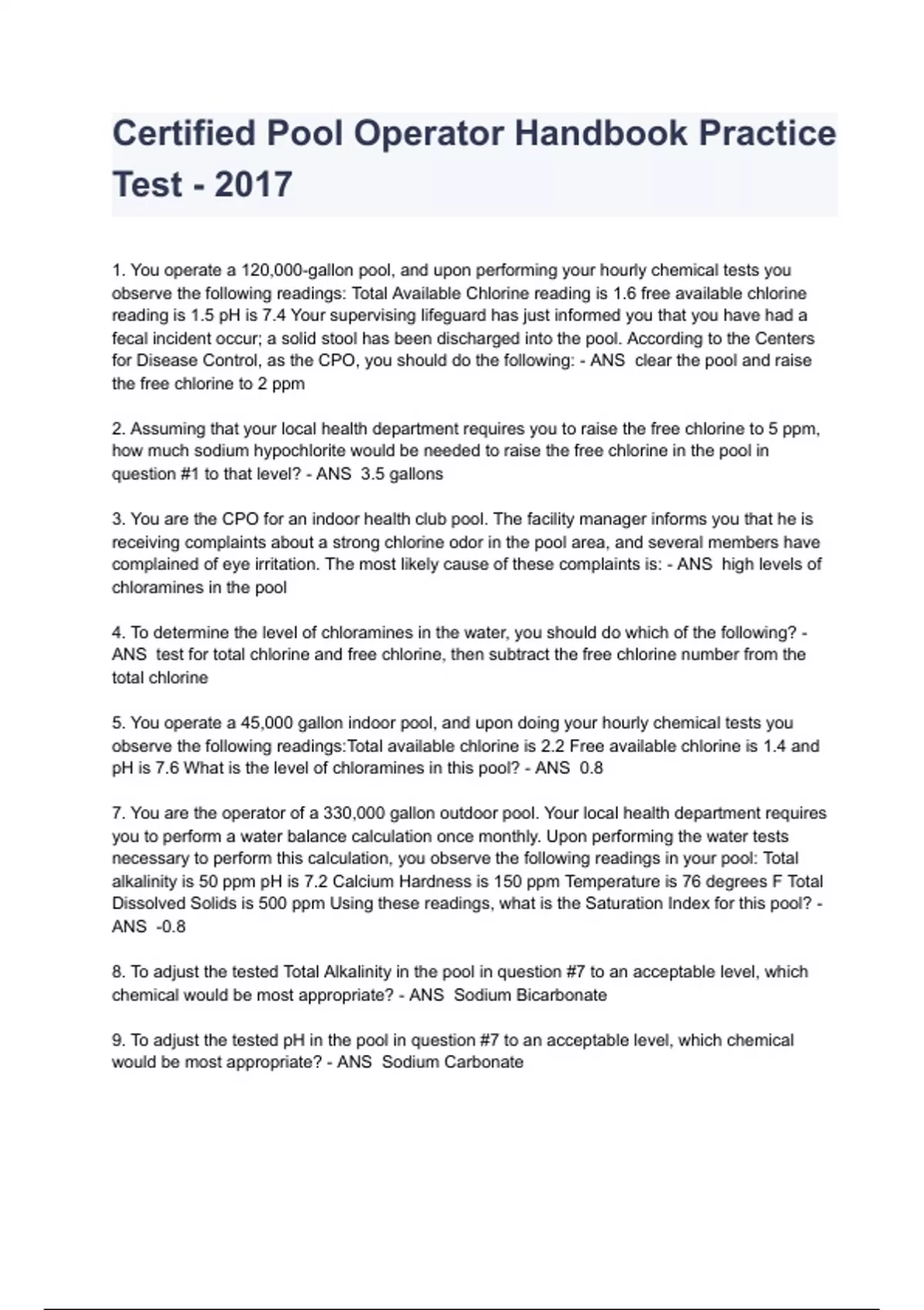 Certified Pool Operator Handbook Practice Test - 2017 LATEST REVIEW 2023 GRADED A+ 1. You operate a 120,000-gallon pool, and upon performing your hourly chemical tests you observe the following readings: Total Available Chlorine reading is 1.6 free available chlorine reading is 1.5 pH is 7.4 Your supervising lifeguard has just informed you that you have had a fecal incident occur; a solid stool has been discharged into the pool. According to the Centers for Disease Control, as the CPO, you should do the following: - ANS clear the pool and raise the free chlorine to 2 ppm 2. Assuming that your local health department requires you to raise the free chlorine to 5 ppm, how much sodium hypochlorite would be needed to raise the free chlorine in the pool in question #1 to that level? - ANS 3.5 gallons 3. You are the CPO for an indoor health club pool. The facility manager informs you that he is receiving complaints about a strong chlorine odor in the pool area, and several members have complained of eye irritation. The most likely cause of these complaints is: - ANS high levels of chloramines in the pool