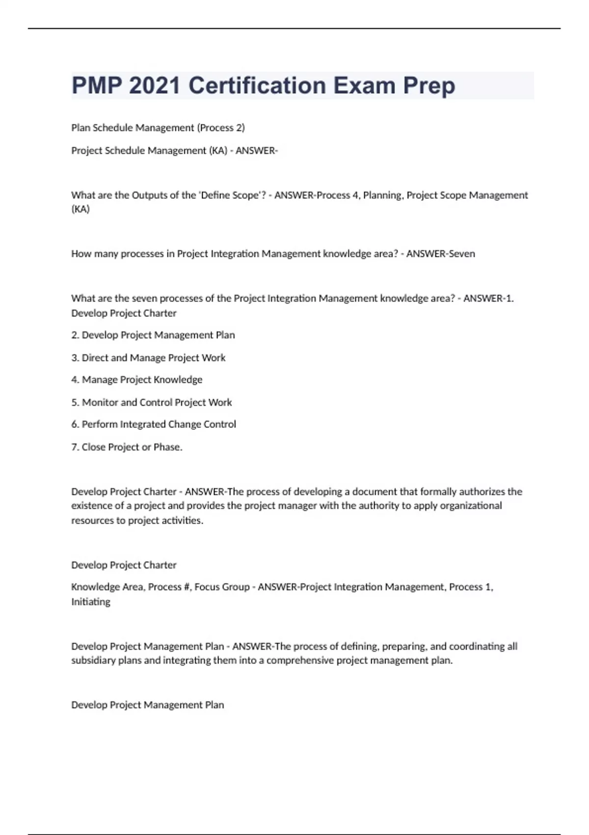 PMP 2021 Certification Exam Prep Plan Schedule Management (Process 2) Project Schedule Management (KA) - ANSWER- What are the Outputs of the 'Define Scope'? - ANSWER-Process 4, Planning, Project Scope Management (KA) How many processes in Project Integration Management knowledge area? - ANSWER-Seven What are the seven processes of the Project Integration Management knowledge area? - ANSWER-1. Develop Project Charter 2. Develop Project Management Plan 3. Direct and Manage Project Work 4. Manage Project Knowledge 5. Monitor and Control Project Work 6. Perform Integrated Change Control 7. Close Project or Phase. Develop Project Charter - ANSWER-The process of developing a document that formally authorizes the existence of a project and provides the project manager with the authority to apply organizational resources to project activities. Develop Project Charter Knowledge Area, Process #, Focus Group - ANSWER-Project Integration Management, Process 1, Initiating Develop Project Management Plan - ANSWER-The process of defining, preparing, and coordinating all subsidiary plans and integrating them into a comprehensive project management plan. Develop Project Management Plan