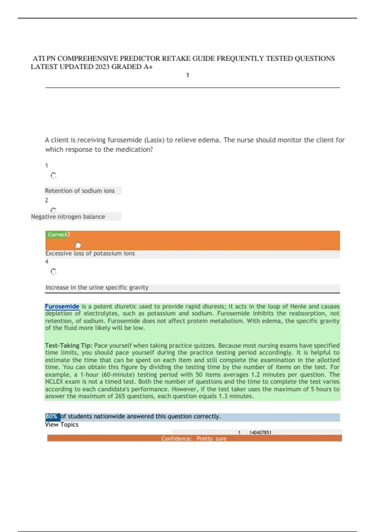 A client is receiving furosemide (Lasix) to relieve edema. The nurse should monitor the client for which response to the medication? 1 Retention of sodium ions 2 Negative nitrogen balance Correct3 Excessive loss of potassium ions 4 Increase in the urine specific gravity Furosemide is a potent diuretic used to provide rapid diuresis; it acts in the loop of Henle and causes depletion of electrolytes, such as potassium and sodium. Furosemide inhibits the reabsorption, not retention, of sodium. Furosemide does not affect protein metabolism. With edema, the specific gravity of the fluid more likely will be low. Test-Taking Tip: Pace yourself when taking practice quizzes. Because most nursing exams have specified time limits, you should pace yourself during the practice testing period accordingly. It is helpful to estimate the time that can be spent on each item and still complete the examination in the allotted time. You can obtain this figure by dividing the testing time by the number of items on the test. For example, a 1-hour (60-minute) testing period with 50 items averages 1.2 minutes per question. The NCLEX exam is not a timed test. Both the number of questions and the time to complete the test varies according to each candidate's performance. However, if the test taker uses the maximum of 5 hours to answer the maximum of 265 questions, each question equals 1.3 minutes. 80% of students nationwide answered this question correctly. View Topics A routine urinalysis is prescribed for a client. What should the nurse do if the specimen cannot be sent immediately to the laboratory? 1 Take no special action. Correct2 Refrigerate the specimen. 3 Store it in the dirty utility room and send it later. 4 Discard the specimen and collect another specimen later. Refrigeration retards the growth of bacteria and may preserve the specimen for several hours. Growth of bacteria will alter the pH and the glucose and protein levels in the urine; it must be refrigerated to retard growth. Discarding the specimen and collecting another specimen later represents an unnecessary waste of time, effort, and money. Test-Taking Tip: Being emotionally prepared for an examination is key to your success. Proper use of this text over an extended period of time ensures your understanding of the mechanics of the examination and increases your confidence about your nursing knowledge. Your lifelong dream of becoming a nurse is now within your reach! You are excited, yet anxious. This feeling is normal. A little anxiety can be good because it increases awareness of reality; but excessive anxiety has the opposite effect, acting as a barrier and keeping you from reaching your goal. Your attitude about yourself and your goals will help keep you focused, adding to your strength and inner conviction to achieve success. 83% of students nationwide answered this question correctly. View Topics Stats Issue with this question? A nurse is notified that the latest potassium level for a client in acute renal failure is 6.2 mEq. What action should the nurse take? 1 Alert the cardiac arrest team Take vital signs and notify the primary health care provider 4 Obtain an ECG strip and obtain an antiarrhythmic medication Vital signs monitor the cardiopulmonary status; the health care provider must treat this hyperkalemia to prevent cardiac dysrhythmias. The cardiac arrest team responds to a cardiac arrest; there is no sign of arrest in this client. A repeat laboratory test will take time and probably reaffirm the original results; the client needs medical attention. Obtaining an ECG strip and having an antiarrhythmic available are correct interventions if available, but the priority is medical attention and the health care provider should be notified immediately. 82% of students nationwide answered this question correctly. View Topics Stats Issue with this question? A client with a diagnosis of uncontrolled diabetes began receiving Lasix (Furosemide) two days ago. The nurse reviews the morning lab results and discovers that the client's potassium level is 2.8 mEq/L. What is the most appropriate action for the nurse to take? 1 Hold the morning dose of the diuretic and have the lab repeat the test. 2 Continue to monitor the level to ensure that it stays within the normal limits. Correct3