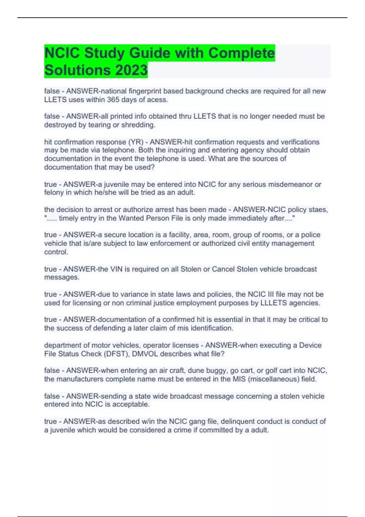 false - ANSWER-national fingerprint based background checks are required for all new LLETS uses within 365 days of acess.
