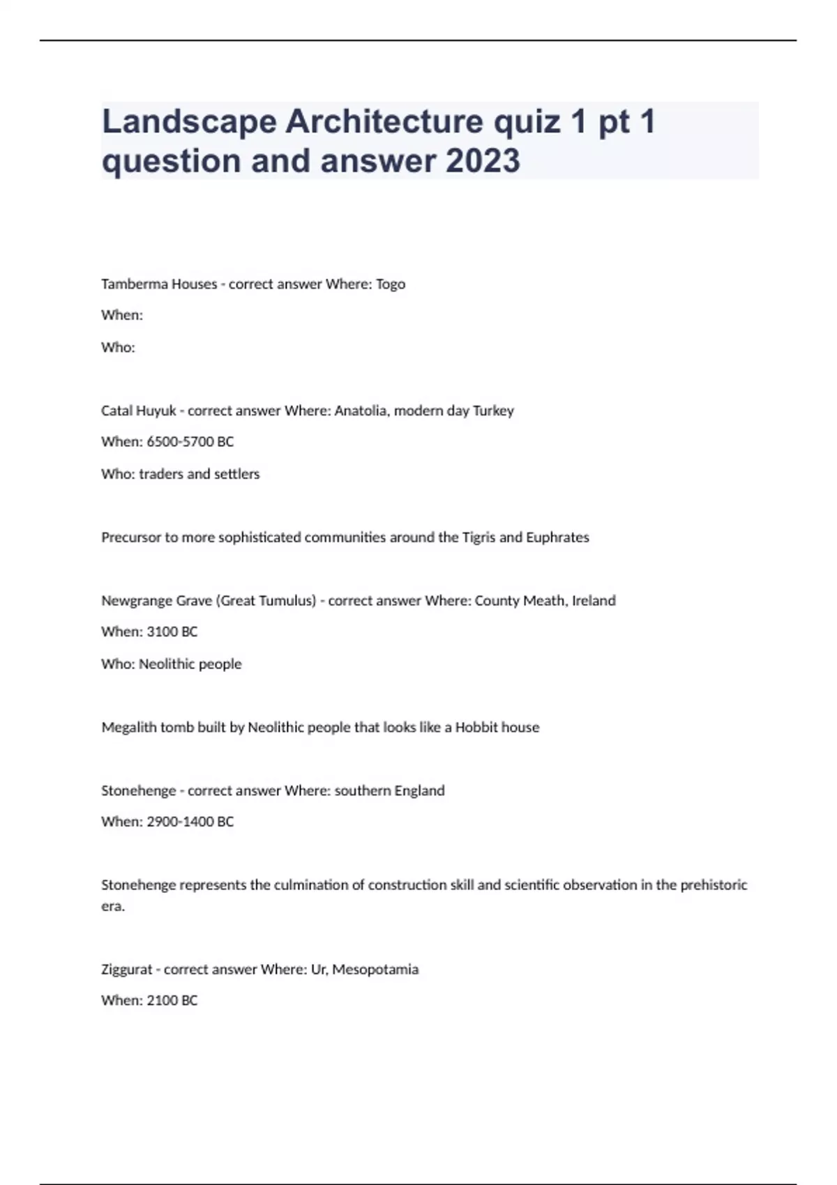 Landscape Architecture quiz 1 pt 1 question and answer 2023Tamberma Houses - correct answer Where: Togo When: Who: Catal Huyuk - correct answer Where: Anatolia, modern day Turkey When: BC Who: traders and settlers Precursor to more sophisticated communities around the Tigris and Euphrates Newgrange Grave (Great Tumulus) - correct answer Where: County Meath, Ireland When: 3100 BC Who: Neolithic people Megalith tomb built by Neolithic people that looks like a Hobbit house Stonehenge - correct answer Where: southern England When: BC Stonehenge represents the culmination of construction skill and scientific observation in the prehistoric era. Ziggurat - correct answer Where: Ur, Mesopotamia When: 2100 BC