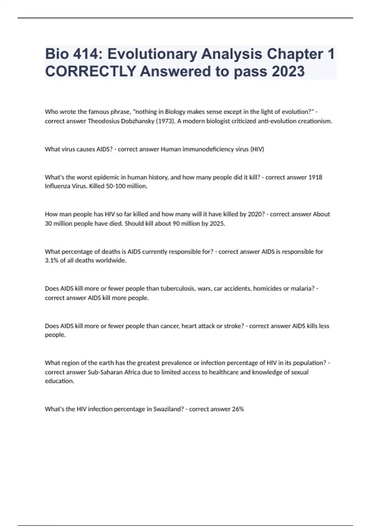 Bio 414: Evolutionary Analysis Chapter 1 CORRECTLY Answered to pass 2023Who wrote the famous phrase, "nothing in Biology makes sense except in the light of evolution?" - correct answer Theodosius Dobzhansky (1973). A modern biologist criticized anti-evolution creationism. What virus causes AIDS? - correct answer Human immunodeficiency virus (HIV) What's the worst epidemic in human history, and how many people did it kill? - correct answer 1918 Influenza Virus. Killed 50-100 million. How man people has HIV so far killed and how many will it have killed by 2020? - correct answer About 30 million people have died. Should kill about 90 million by 2025. What percentage of deaths is AIDS currently responsible for? - correct answer AIDS is responsible for 3.1% of all deaths worldwide. Does AIDS kill more or fewer people than tuberculosis, wars, car accidents, homicides or malaria? - correct answer AIDS kill more people. Does AIDS kill more or fewer people than cancer, heart attack or stroke? - correct answer AIDS kills less people. What region of the earth has the greatest prevalence or infection percentage of HIV in its population? - correct answer Sub-Saharan Africa due to limited access to healthcare and knowledge of sexual education. What's the HIV infection percentage in Swaziland? - correct answer 26%