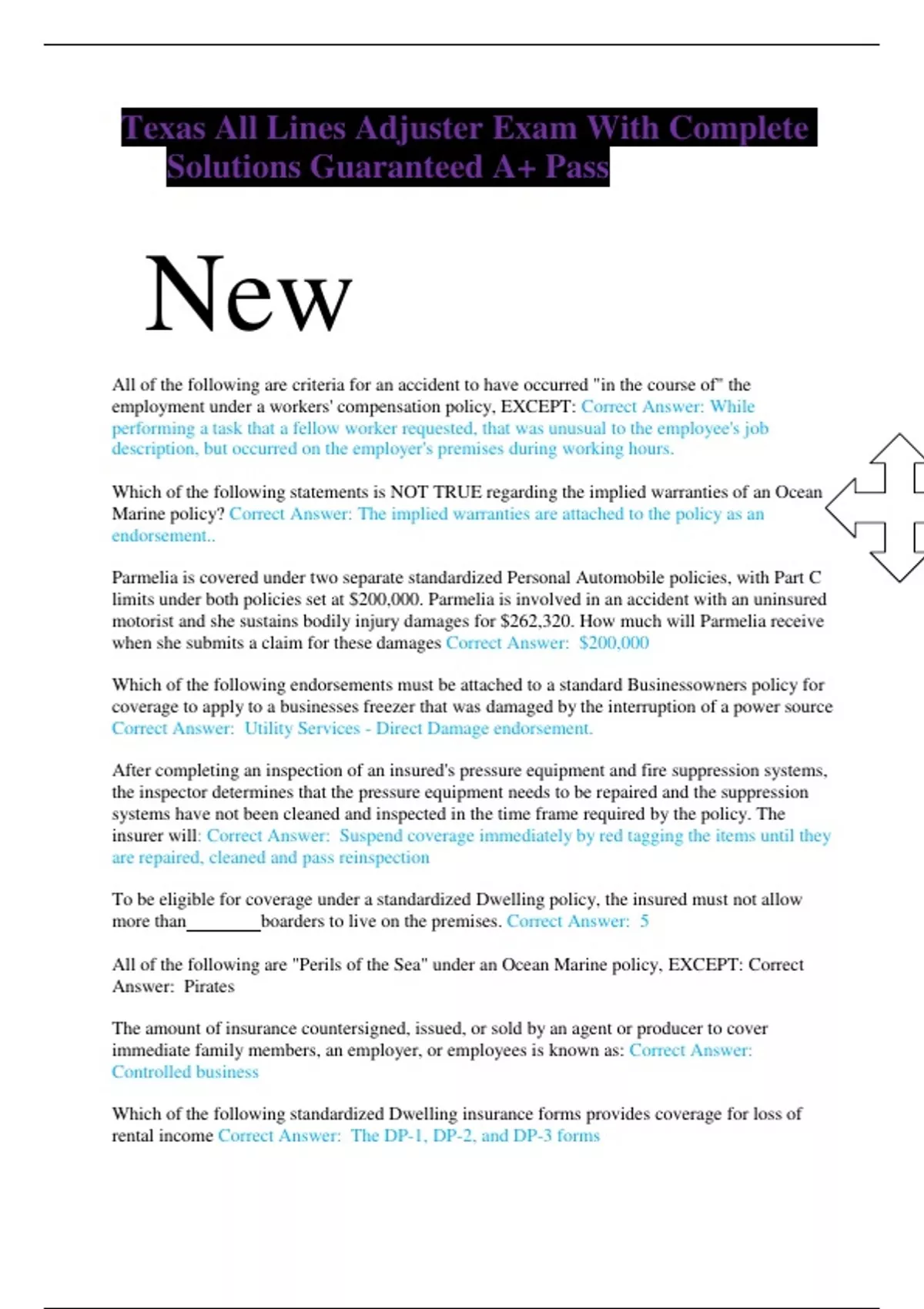 Texas All Lines Adjuster Exam With Complete Solutions Guaranteed A+ Pass