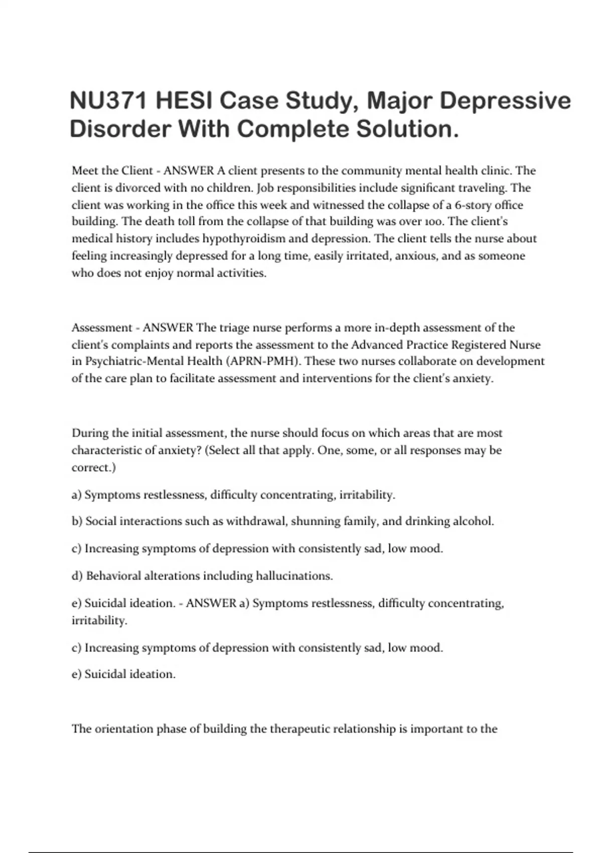 NU371 HESI Case Study, Major Depressive Disorder With Complete Solution. Meet the Client - ANSWER A client presents to the community mental health clinic. The client is divorced with no children. Job responsibilities include significant traveling. The client was working in the office this week and witnessed the collapse of a 6-story office building. The death toll from the collapse of that building was over 100. The client's medical history includes hypothyroidism and depression. The client tells the nurse about feeling increasingly depressed for a long time, easily irritated, anxious, and as someone who does not enjoy normal activities. Assessment - ANSWER The triage nurse performs a more in-depth assessment of the client's complaints and reports the assessment to the Advanced Practice Registered Nurse in Psychiatric-Mental Health (APRN-PMH). These two nurses collaborate on development of the care plan to facilitate assessment and interventions for the client's anxiety. During the initial assessment, the nurse should focus on which areas that are most characteristic of anxiety? (Select all that apply. One, some, or all responses may be correct.) a) Symptoms restlessness, difficulty concentrating, irritability. b) Social interactions such as withdrawal, shunning family, and drinking alcohol. c) Increasing symptoms of depression with consistently sad, low mood. d) Behavioral alterations including hallucinations. e) Suicidal ideation. - ANSWER a) Symptoms restlessness, difficulty concentrating, irritability. c) Increasing symptoms of depression with consistently sad, low mood. e) Suicidal ideation. The orientation phase of building the therapeutic relationship is important to the establishment in which rapport can grow. Which approach is best for the nurse to use when assessing for subjective information from the client? a) Have the client say what is causing the anxiety. b) Tell the client that it sounds like the anxiety is causing depression. c) Get the client to explain how anxiety affects normal activities. d) Ask the client to give an example of how they feel when they are anxious. - ANSWER d) Ask the client to give an example of how they feel when they are anxious. - This statement of asking for an example can clarify vague statements made by a client with anxiety . The client meets with the nurse. During the group session, the client tells the nurse about an extreme amount of stress at work. The client has filed multiple harassment complaints against the boss. The client states feeling it is necessary to hold self to a higher set of standards than coworkers because their boss uses a stricter set of standards for the client's performance appraisal. - ANSWER - The nurse recognizes that the client is experiencing what level of anxiety? a) Mild b) Moderate c) Severe d) Panic - ANSWER c) Severe - The individual with severe anxiety can only focus on a narrowed area of concern, such as the client only focusing on her employer and coworkers. Planning - ANSWER During the interview, the client identifies intense anxiety, irritability, and feelings of depression with thoughts of suicide as reasons for seeking treatment. The nurse develops a plan of care to assist the client in managing anxiety. Which approach is best for the nurse to use when assessing a client's risk for attempting suicide? a) Tell the client to express which specific stress causes anxiety. b) Find out from client how is their social life at work and at home. c) Have the client explain what causes worse feelings. d) Ask the client about having a plan to harm self. - ANSWER d) Ask the client about having a plan to harm self. - Assessment of suicidal intent and determining if there is an actual, viable plan is the most important component of client assessment and care plan development. The client tells the nurse about sweating all the time and occasional chest pains, plus numbness in arms and hands. - ANSWER - How should the nurse respond to the client's comments? a) Tell the client that these issues are probably due to anxiety. b) Ask the client about the most recent check-up. c) Distract the client from worrying about these symptoms right now. d) Have the client elaborate on experiencing chest pain. - ANSWER d) Have the client elaborate on experiencing chest pain. - It is important for the nurse to understand the client's perception of the problems before making further recommendations.