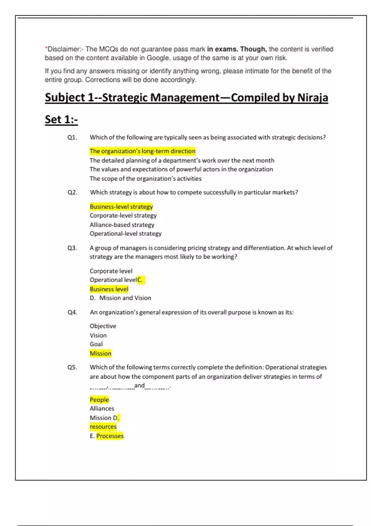 - The MCQs do not guarantee pass mark in exams. Though, the content is verified based on the content available in Google, usage of the same is at your own risk. If you find any answers missing or identify anything wrong, please intimate for the benefit of the entire group. Corrections will be done accordingly. Subject 1--Strategic Management—Compiled by Niraja Set 1:- Q1. Which of the following are typically seen as being associated with strategic decisions? Q2. Which strategy is about how to compete successfully in particular markets? Q3. A group of managers is considering pricing strategy and differentiation. At which level of strategy are the managers most likely to be working? Q4. An organization’s general expression of its overall purpose is known as its: Q5. Which of the following terms correctly complete the definition: Operational strategies are about how the component parts of an organization deliver strategies in terms of , and . Q6. Strategy involves: Q7. What are the 3 main branches of strategy research that make up the study of strategy? Q8. In the Exploring strategy Model, what heading is used to cover environment, capability, goals and culture? Q9. A design view of strategy refers to: Q10. The experience lens suggests that strategies develop: Q11. The variety lens suggests that new strategies take shape in organizations: Because new ideas are tried out in the market and either succeed or do not. Q12. What is the key outcome from PESTEL analysis? Q13. When using PESTEL it is easy to get overwhelmed by a multitude of ideas. Instead, it is important to step back and identify the: Q14. Which three of the following are the most useful ways in which a group of managers could use scenario planning? ....................................................continued.............................................