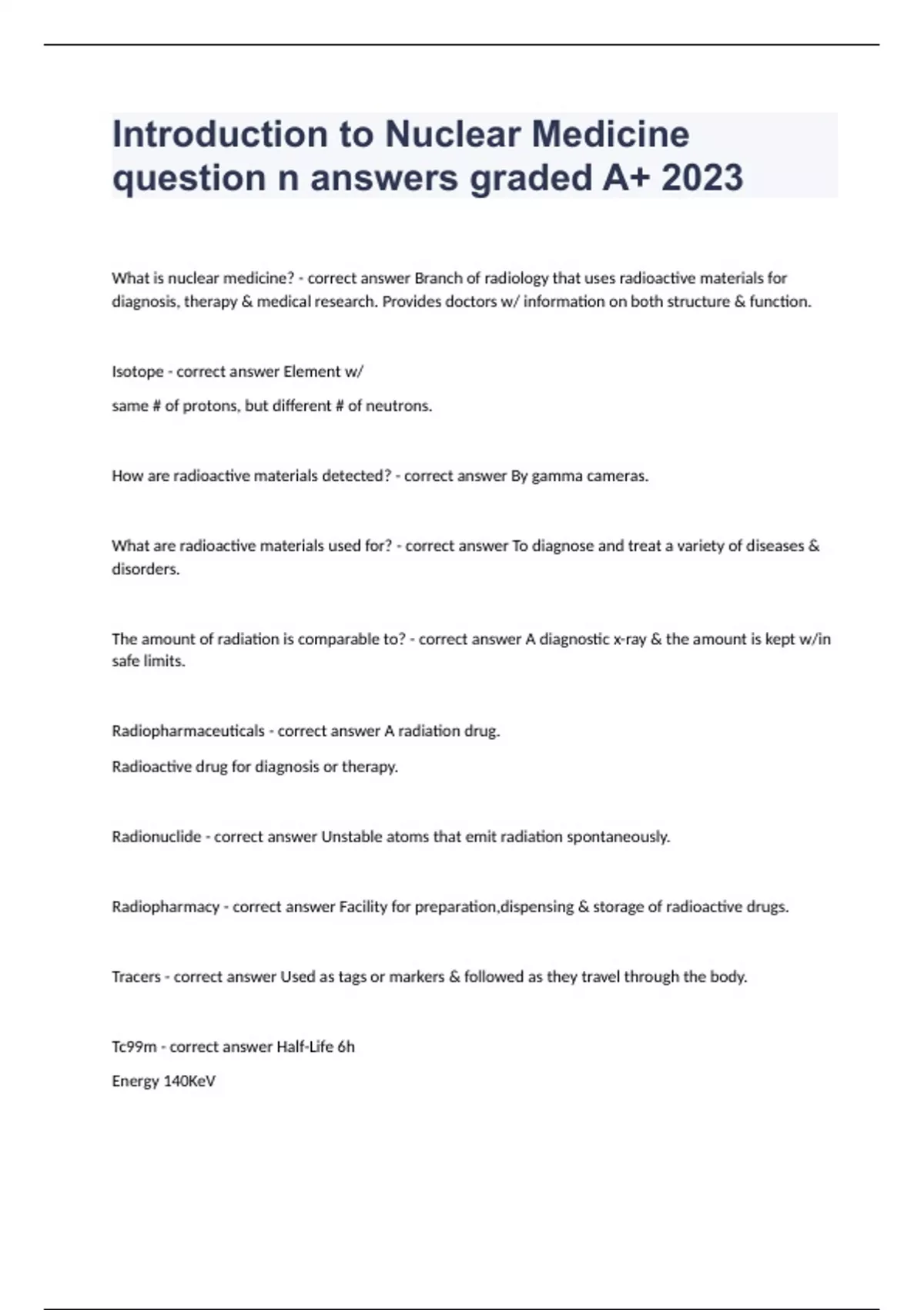 Introduction to Nuclear Medicine question n answers graded A+ 2023What is nuclear medicine? - correct answer Branch of radiology that uses radioactive materials for diagnosis, therapy & medical research. Provides doctors w/ information on both structure & function. Isotope - correct answer Element w/ same # of protons, but different # of neutrons. How are radioactive materials detected? - correct answer By gamma cameras. What are radioactive materials used for? - correct answer To diagnose and treat a variety of diseases & disorders. The amount of radiation is comparable to? - correct answer A diagnostic x-ray & the amount is kept w/in safe limits. Radiopharmaceuticals - correct answer A radiation drug. Radioactive drug for diagnosis or therapy. Radionuclide - correct answer Unstable atoms that emit radiation spontaneously. Radiopharmacy - correct answer Facility for preparation,dispensing & storage of radioactive drugs. Tracers - correct answer Used as tags or markers & followed as they travel through the body. Tc99m - correct answer Half-Life 6h Energy 140KeV