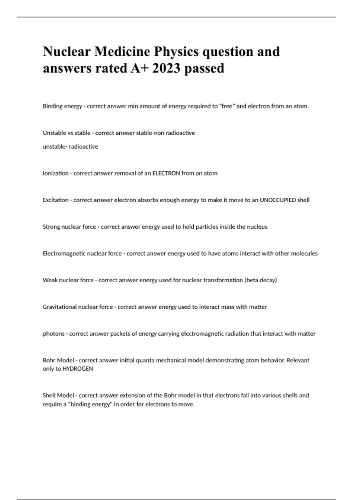Nuclear Medicine Physics question and answers rated A+ 2023 passedBinding energy - correct answer min amount of energy required to "free" and electron from an atom. Unstable vs stable - correct answer stable-non radioactive unstable- radioactive Ionization - correct answer removal of an ELECTRON from an atom Excitation - correct answer electron absorbs enough energy to make it move to an UNOCCUPIED shell Strong nuclear force - correct answer energy used to hold particles inside the nucleus Electromagnetic nuclear force - correct answer energy used to have atoms interact with other molecules Weak nuclear force - correct answer energy used for nuclear transformation (beta decay) Gravitational nuclear force - correct answer energy used to interact mass with matter photons - correct answer packets of energy carrying electromagnetic radiation that interact with matter Bohr Model - correct answer initial quanta mechanical model demonstrating atom behavior. Relevant only to HYDROGEN Shell Model - correct answer extension of the Bohr model in that electrons fall into various shells and require a "binding energy" in order for electrons to move.