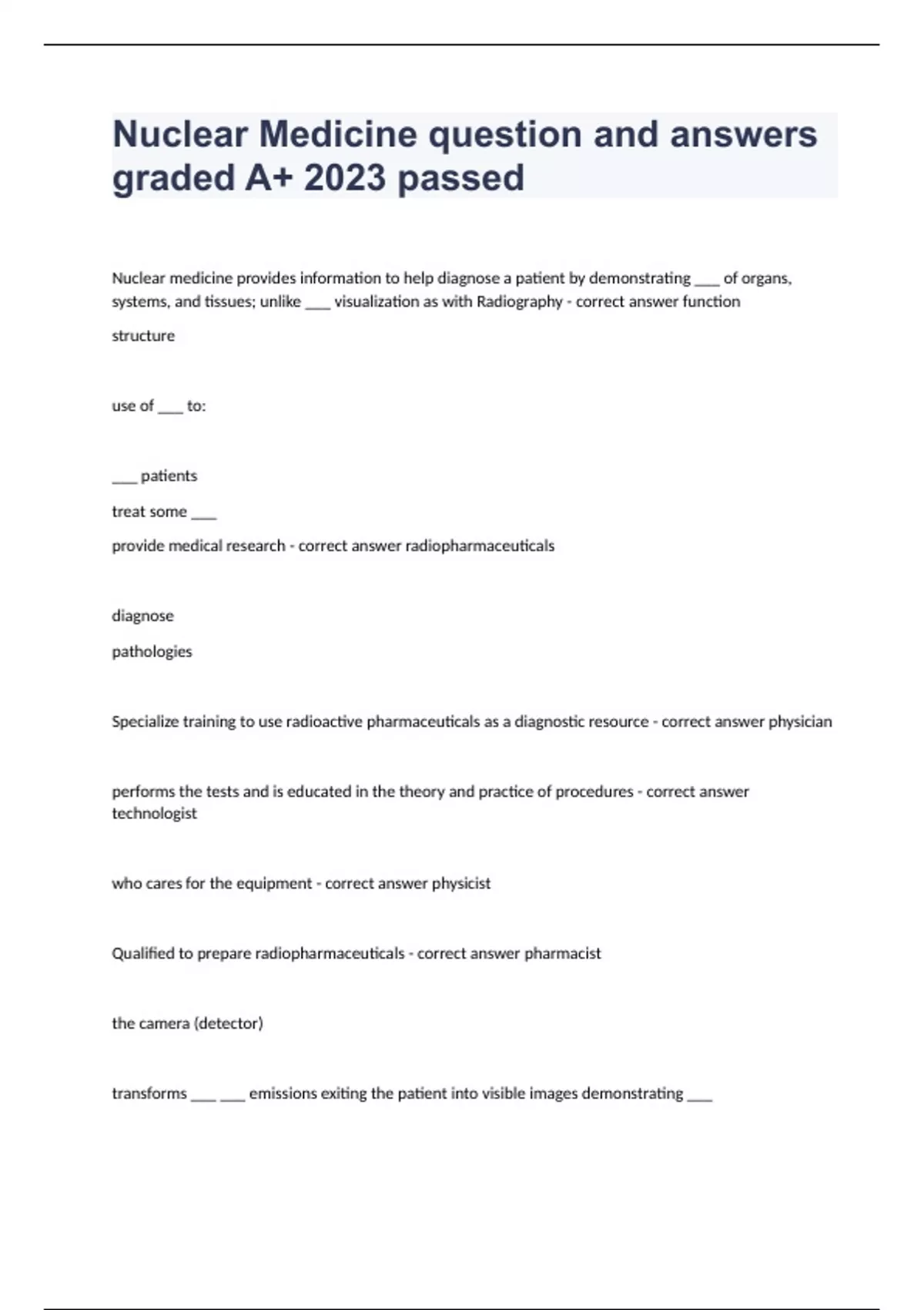 Nuclear Medicine question and answers graded A+ 2023 passed Nuclear medicine provides information to help diagnose a patient by demonstrating ___ of organs, systems, and tissues; unlike ___ visualization as with Radiography - correct answer function structure use of ___ to: ___ patients treat some ___ provide medical research - correct answer radiopharmaceuticals diagnose pathologies Specialize training to use radioactive pharmaceuticals as a diagnostic resource - correct answer physician performs the tests and is educated in the theory and practice of procedures - correct answer technologist who cares for the equipment - correct answer physicist Qualified to prepare radiopharmaceuticals - correct answer pharmacist the camera (detector) transforms ___ ___ emissions exiting the patient into visible images demonstrating ___