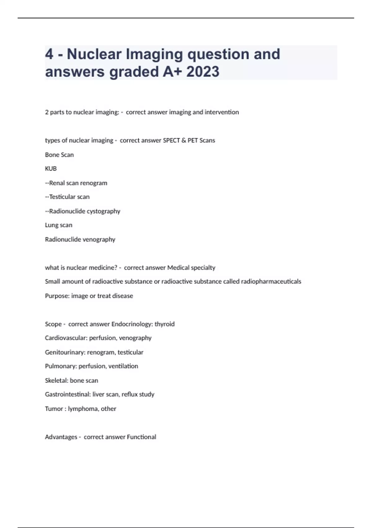 4 - Nuclear Imaging question and answers graded A+ 20232 parts to nuclear imaging: - correct answer imaging and intervention types of nuclear imaging - correct answer SPECT & PET Scans Bone Scan KUB --Renal scan renogram --Testicular scan --Radionuclide cystography Lung scan Radionuclide venography what is nuclear medicine? - correct answer Medical specialty Small amount of radioactive substance or radioactive substance called radiopharmaceuticals Purpose: image or treat disease Scope - correct answer Endocrinology: thyroid Cardiovascular: perfusion, venography Genitourinary: renogram, testicular Pulmonary: perfusion, ventilation Skeletal: bone scan Gastrointestinal: liver scan, reflux study Tumor : lymphoma, other Advantages - correct answer Functional