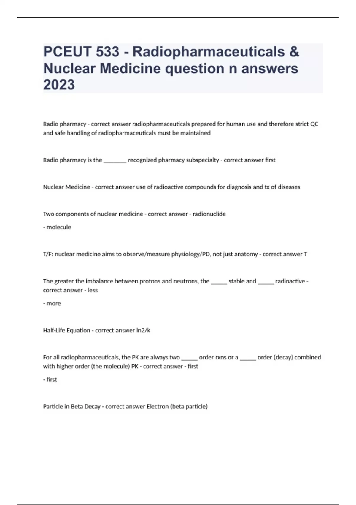 PCEUT 533 - Radiopharmaceuticals & Nuclear Medicine question n answers 2023 Radio pharmacy - correct answer radiopharmaceuticals prepared for human use and therefore strict QC and safe handling of radiopharmaceuticals must be maintained Radio pharmacy is the _______ recognized pharmacy subspecialty - correct answer first Nuclear Medicine - correct answer use of radioactive compounds for diagnosis and tx of diseases Two components of nuclear medicine - correct answer - radionuclide - molecule T/F: nuclear medicine aims to observe/measure physiology/PD, not just anatomy - correct answer T The greater the imbalance between protons and neutrons, the _____ stable and _____ radioactive - correct answer - less - more Half-Life Equation - correct answer ln2/k For all radiopharmaceuticals, the PK are always two _____ order rxns or a _____ order (decay) combined with higher order (the molecule) PK - correct answer - first - first Particle in Beta Decay - correct answer Electron (beta particle)