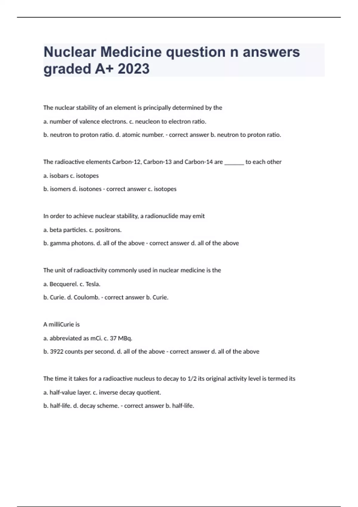 Nuclear Medicine question n answers graded A+ 2023The nuclear stability of an element is principally determined by the a. number of valence electrons. c. neucleon to electron ratio. b. neutron to proton ratio. d. atomic number. - correct answer b. neutron to proton ratio. The radioactive elements Carbon-12, Carbon-13 and Carbon-14 are ______ to each other a. isobars c. isotopes b. isomers d. isotones - correct answer c. isotopes In order to achieve nuclear stability, a radionuclide may emit a. beta particles. c. positrons. b. gamma photons. d. all of the above - correct answer d. all of the above The unit of radioactivity commonly used in nuclear medicine is the a. Becquerel. c. Tesla. b. Curie. d. Coulomb. - correct answer b. Curie. A milliCurie is a. abbreviated as mCi. c. 37 MBq. b. 3922 counts per second. d. all of the above - correct answer d. all of the above The time it takes for a radioactive nucleus to decay to 1/2 its original activity level is termed its a. half-value layer. c. inverse decay quotient. b. half-life. d. decay scheme. - correct answer b. half-life. The physical half-life of technetium-99 is approximately a. 110 minutes. c. 6 hours. b. 2 hours. d. 73 hours. - correct answer c. 6 hours. The biological half-life of a radionuclide takes into account its a. physical decay scheme. b. physical half-life. c. metabolism within the human body. d. effective half-life. - correct answer c. metabolism within the human body. All of the following are true of a radionuclide effective half-life EXCEPT: a. It takes into account the relationship between physical and biologic half-lives. b. It is the product of the physical and biologic half-lives divided by the sum of the physical and biologic half-lives. c. It is always shorter than either the physical half-life or biologic half-life. d. It is of little importance as a consideration of radionuclides used for medical diagnosis. - correct answer d. It is of little importance as a consideration of radionuclides used for medical diagnosis. Historically, the discoverer of radioactivity was a. Pierre and Marie Curie. c. Henry Becquerel. b. Michael Faraday. d. Albert Einstein. - correct answer c. Henry Becquerel. The isotope of choice for most nuclear medicine medical procedures is a. Gallium-67. c. Fluorine-18. b. Iodine-131. d. Technetium-99m. - correct answer d. Technetium-99m. Technetium-99m is an ideal isotope because of its a. long half-life. c. low energy range. b. alpha particle emissions. d. none of the above - correct answer d. none of the above