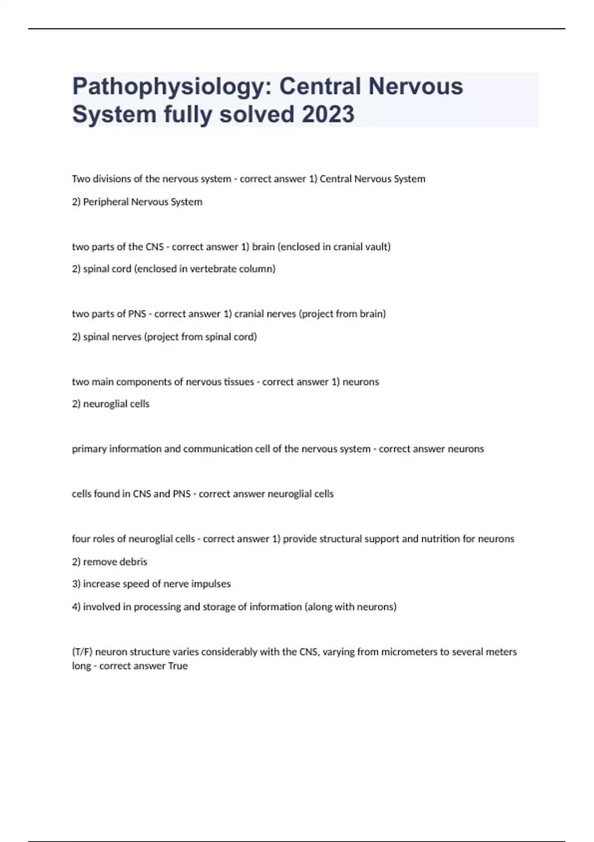 Pathophysiology: Central Nervous System fully solved 2023Two divisions of the nervous system - correct answer 1) Central Nervous System 2) Peripheral Nervous System two parts of the CNS - correct answer 1) brain (enclosed in cranial vault) 2) spinal cord (enclosed in vertebrate column) two parts of PNS - correct answer 1) cranial nerves (project from brain) 2) spinal nerves (project from spinal cord) two main components of nervous tissues - correct answer 1) neurons 2) neuroglial cells primary information and communication cell of the nervous system - correct answer neurons cells found in CNS and PNS - correct answer neuroglial cells four roles of neuroglial cells - correct answer 1) provide structural support and nutrition for neurons 2) remove debris 3) increase speed of nerve impulses 4) involved in processing and storage of information (along with neurons) (T/F) neuron structure varies considerably with the CNS, varying from micrometers to several meters long - correct answer True