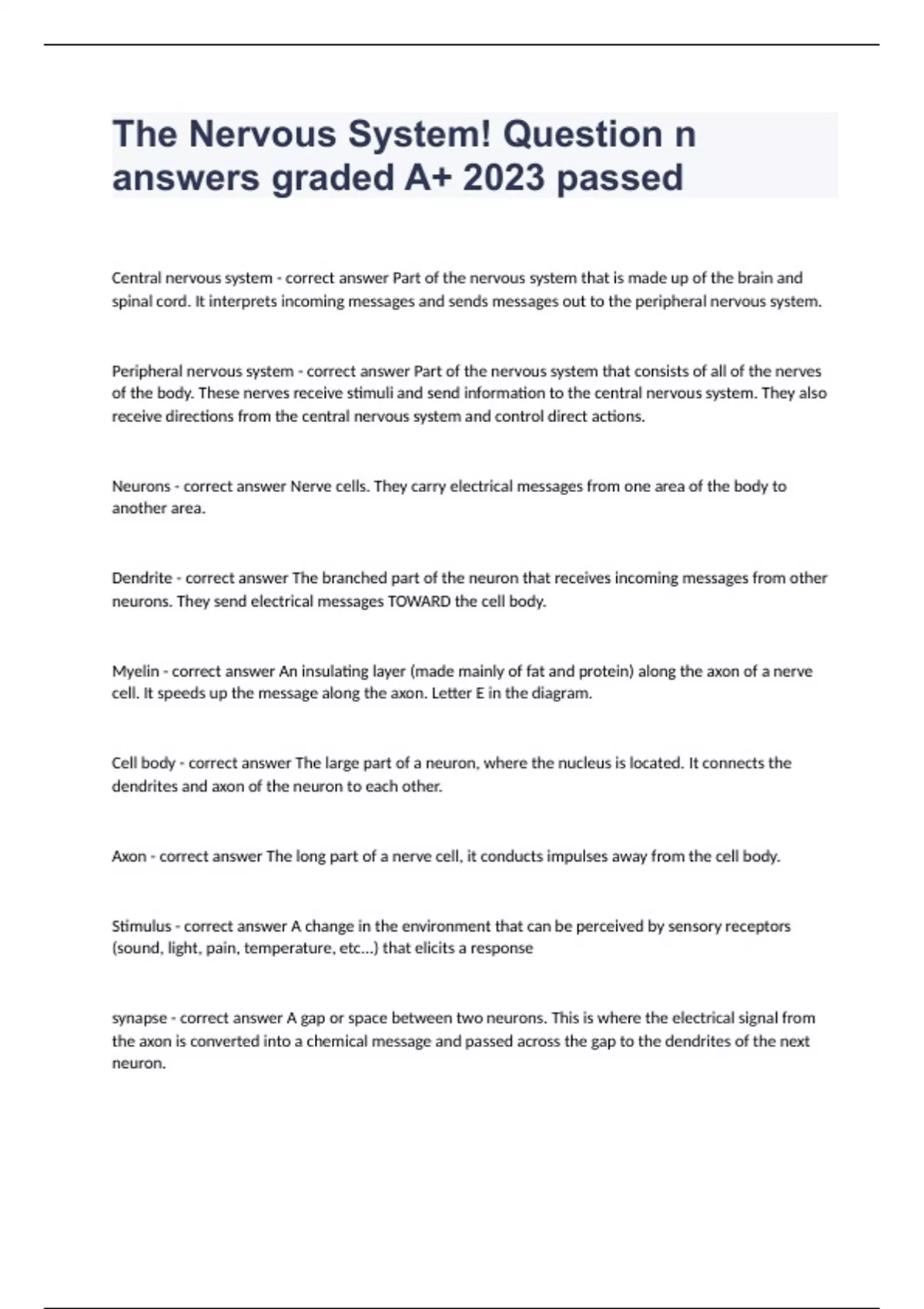 The Nervous System! Question n answers graded A+ 2023 passedCentral nervous system - correct answer Part of the nervous system that is made up of the brain and spinal cord. It interprets incoming messages and sends messages out to the peripheral nervous system. Peripheral nervous system - correct answer Part of the nervous system that consists of all of the nerves of the body. These nerves receive stimuli and send information to the central nervous system. They also receive directions from the central nervous system and control direct actions. Neurons - correct answer Nerve cells. They carry electrical messages from one area of the body to another area. Dendrite - correct answer The branched part of the neuron that receives incoming messages from other neurons. They send electrical messages TOWARD the cell body. Myelin - correct answer An insulating layer (made mainly of fat and protein) along the axon of a nerve cell. It speeds up the message along the axon. Letter E in the diagram. Cell body - correct answer The large part of a neuron, where the nucleus is located. It connects the dendrites and axon of the neuron to each other. Axon - correct answer The long part of a nerve cell, it conducts impulses away from the cell body. Stimulus - correct answer A change in the environment that can be perceived by sensory receptors (sound, light, pain, temperature, etc...) that elicits a response synapse - correct answer A gap or space between two neurons. This is where the electrical signal from the axon is converted into a chemical message and passed across the gap to the dendrites of the next neuron.