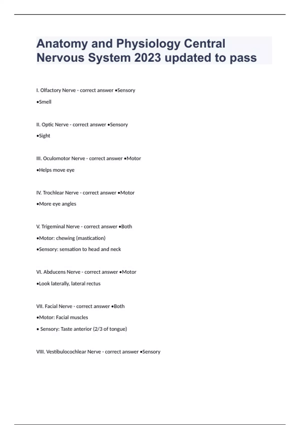 Anatomy and Physiology Central Nervous System 2023 updated to passI. Olfactory Nerve - correct answer •Sensory •Smell II. Optic Nerve - correct answer •Sensory •Sight III. Oculomotor Nerve - correct answer •Motor •Helps move eye IV. Trochlear Nerve - correct answer •Motor •More eye angles V. Trigeminal Nerve - correct answer •Both •Motor: chewing (mastication) •Sensory: sensation to head and neck VI. Abducens Nerve - correct answer •Motor •Look laterally, lateral rectus VII. Facial Nerve - correct answer •Both •Motor: Facial muscles • Sensory: Taste anterior (2/3 of tongue) VIII. Vestibulocochlear Nerve - correct answer •Sensory