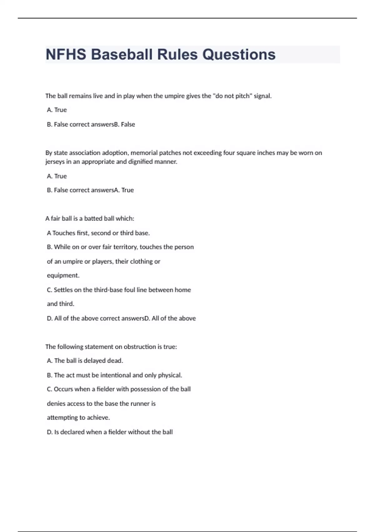 The ball remains live and in play when the umpire gives the "do not pitch" signal. A. True B. False correct answersB. False By state association adoption, memorial patches not exceeding four square inches may be worn on jerseys in an appropriate and dignified manner. A. True B. False correct answersA. True A fair ball is a batted ball which: A Touches first, second or third base. B. While on or over fair territory, touches the person of an umpire or players, their clothing or equipment. C. Settles on the third-base foul line between home and third. D. All of the above correct answersD. All of the above