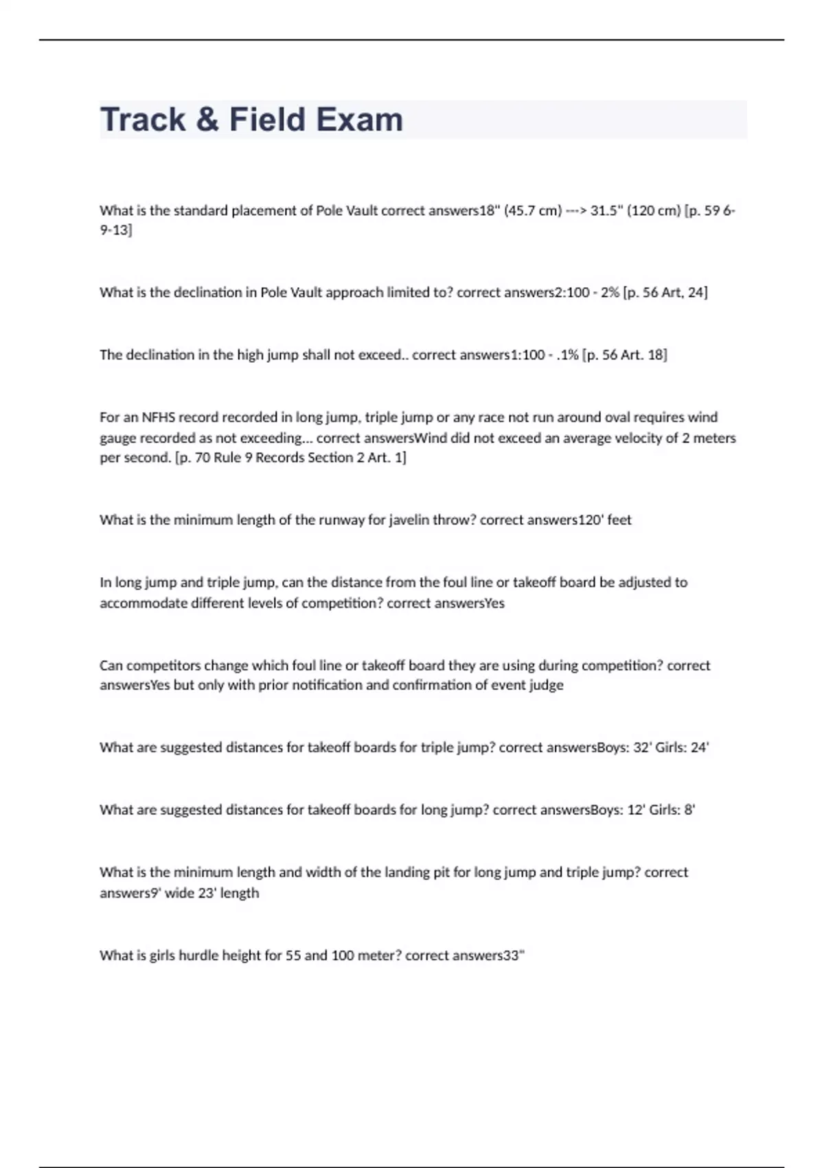 What is the standard placement of Pole Vault correct answers18" (45.7 cm) ---> 31.5" (120 cm) [p. 59 6-9-13] What is the declination in Pole Vault approach limited to? correct answers2:100 - 2% [p. 56 Art, 24] The declination in the high jump shall not exceed.. correct answers1:100 - .1% [p. 56 Art. 18] For an NFHS record recorded in long jump, triple jump or any race not run around oval requires wind gauge recorded as not exceeding... correct answersWind did not exceed an average velocity of 2 meters per second. [p. 70 Rule 9 Records Section 2 Art. 1] What is the minimum length of the runway for javelin throw? correct answers120' feet In long jump and triple jump, can the distance from the foul line or takeoff board be adjusted to accommodate different levels of competition? correct answersYes