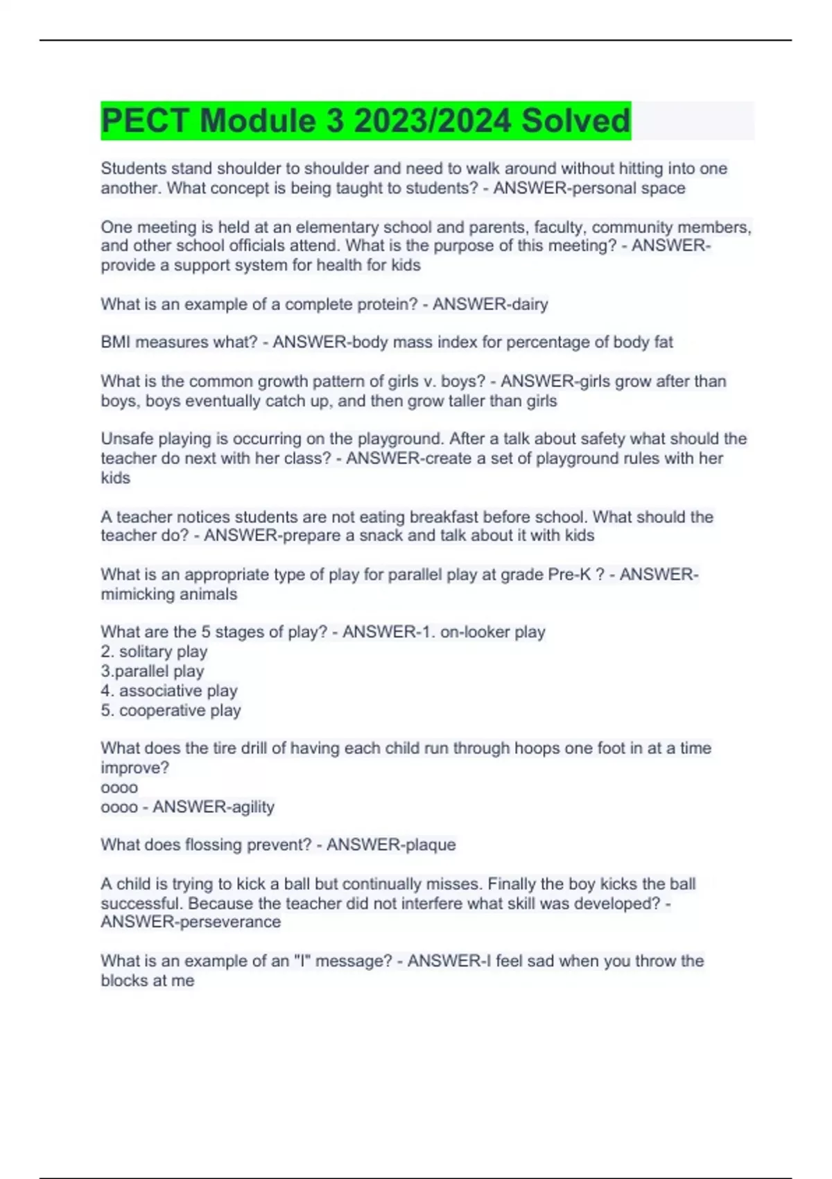 Students stand shoulder to shoulder and need to walk around without hitting into one another. What concept is being taught to students? - ANSWER-personal space One meeting is held at an elementary school and parents, faculty, community members, and other school officials attend. What is the purpose of this meeting? - ANSWER-provide a support system for health for kids What is an example of a complete protein? - ANSWER-dairy BMI measures what? - ANSWER-body mass index for percentage of body fat What is the common growth pattern of girls v. boys? - ANSWER-girls grow after than boys, boys eventually catch up, and then grow taller than girls Unsafe playing is occurring on the playground. After a talk about safety what should the teacher do next with her class? - ANSWER-create a set of playground rules with her kids A teacher notices students are not eating breakfast before school. What should the teacher do? - ANSWER-prepare a snack and talk about it with kids What is an appropriate type of play for parallel play at grade Pre-K ? - ANSWER-mimicking animals What are the 5 stages of play? - ANSWER-1. on-looker play 2. solitary play lel play 4. associative play 5. cooperative play What does the tire drill of having each child run through hoops one foot in at a time improve? oooo oooo - ANSWER-agility What does flossing prevent? - ANSWER-plaque A child is trying to kick a ball but continually misses. Finally the boy kicks the ball successful. Because the teacher did not interfere what skill was developed? - ANSWER-perseverance What is an example of an "I" message? - ANSWER-I feel sad when you throw the blocks at me