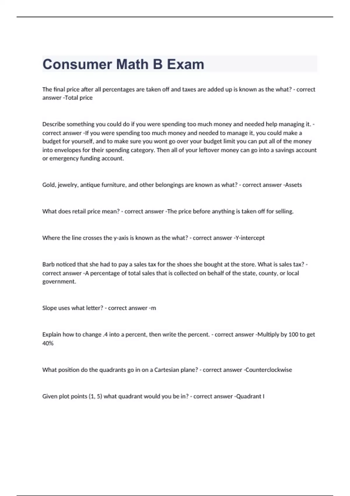 The final price after all percentages are taken off and taxes are added up is known as the what? Total price Describe something you could do if you were spending too much money and needed help managing it. If you were spending too much money and needed to manage it, you could make a budget for yourself, and to make sure you wont go over your budget limit you can put all of the money into envelopes for their spending category. Then all of your leftover money can go into a savings account or emergency funding account. Gold, jewelry, antique furniture, and other belongings are known as what? Assets What does retail price mean? The price before anything is taken off for selling. Where the line crosses the y-axis is known as the what? Y-intercept Barb noticed that she had to pay a sales tax for the shoes she bought at the store. What is sales tax? A percentage of total sales that is collected on behalf of the state, county, or local government. Slope uses what letter? m Explain how to change .4 into a percent, then write the percent. Multiply by 100 to get 40% What position do the quadrants go in on a Cartesian plane? Counterclockwise Given plot points (1, 5) what quadrant would you be in? Quadrant I