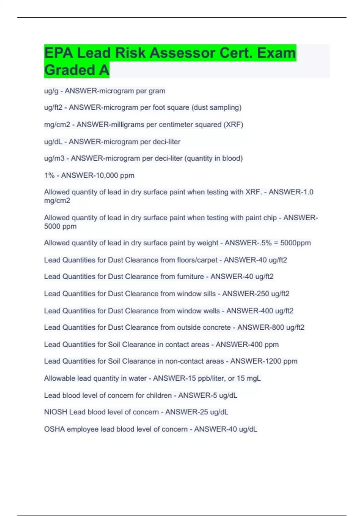 ug/g - ANSWER-microgram per gram ug/ft2 - ANSWER-microgram per foot square (dust sampling) mg/cm2 - ANSWER-milligrams per centimeter squared (XRF) ug/dL - ANSWER-microgram per deci-liter ug/m3 - ANSWER-microgram per deci-liter (quantity in blood) 1% - ANSWER-10,000 ppm Allowed quantity of lead in dry surface paint when testing with XRF. - ANSWER-1.0 mg/cm2 Allowed quantity of lead in dry surface paint when testing with paint chip - ANSWER-5000 ppm Allowed quantity of lead in dry surface paint by weight - ANSWER-.5% = 5000ppm Lead Quantities for Dust Clearance from floors/carpet - ANSWER-40 ug/ft2 Lead Quantities for Dust Clearance from furniture - ANSWER-40 ug/ft2 Lead Quantities for Dust Clearance from window sills - ANSWER-250 ug/ft2 Lead Quantities for Dust Clearance from window wells - ANSWER-400 ug/ft2 Lead Quantities for Dust Clearance from outside concrete - ANSWER-800 ug/ft2 Lead Quantities for Soil Clearance in contact areas - ANSWER-400 ppm Lead Quantities for Soil Clearance in non-contact areas - ANSWER-1200 ppm Allowable lead quantity in water - ANSWER-15 ppb/liter, or 15 mgL Lead blood level of concern for children - ANSWER-5 ug/dL NIOSH Lead blood level of concern - ANSWER-25 ug/dL OSHA employee lead blood level of concern - ANSWER-40 ug/dL