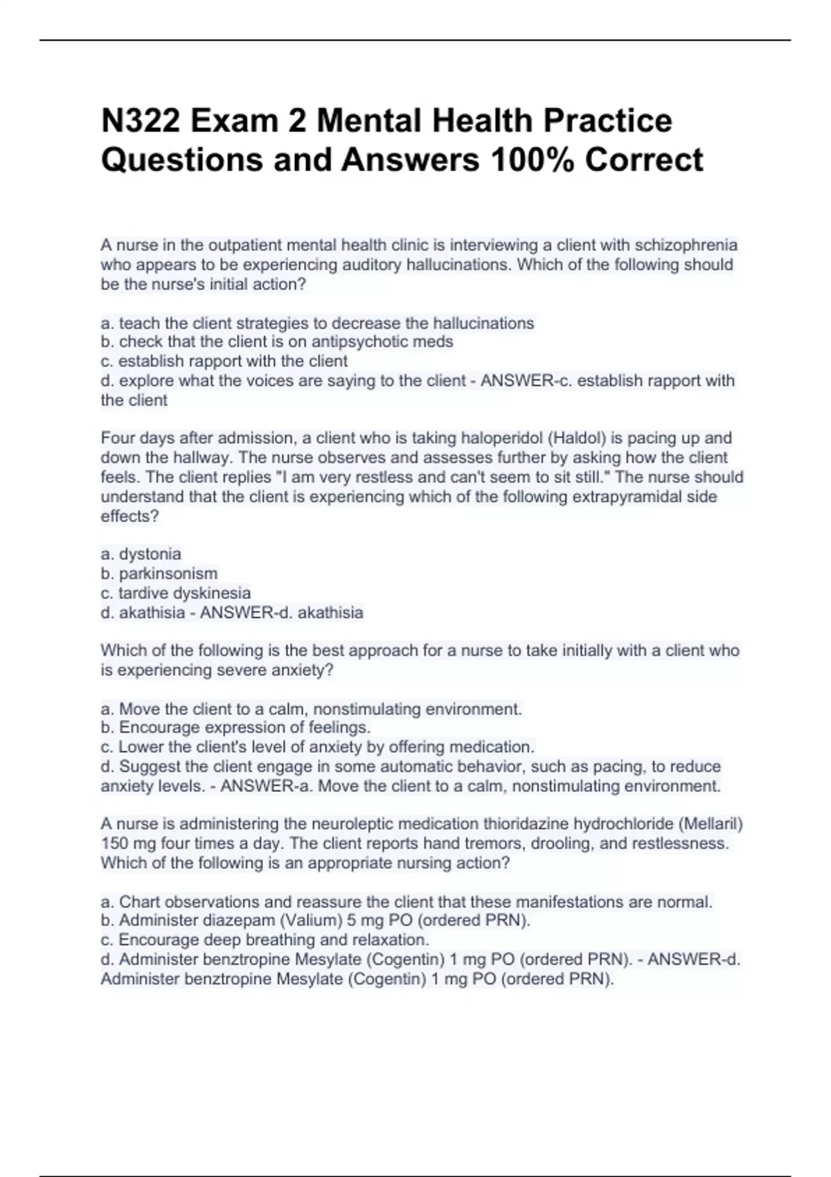 N322 Exam 2 Mental Health Practice Questions and Answers 100% CorrectN322 Exam 2 Mental Health Practice Questions and Answers 100% CorrectN322 Exam 2 Mental Health Practice Questions and Answers 100% CorrectA nurse in the outpatient mental health clinic is interviewing a client with schizophrenia who appears to be experiencing auditory hallucinations. Which of the following should be the nurse's initial action? a. teach the client strategies to decrease the hallucinations b. check that the client is on antipsychotic meds c. establish rapport with the client d. explore what the voices are saying to the client - ANSWER-c. establish rapport with the client Four days after admission, a client who is taking haloperidol (Haldol) is pacing up and down the hallway. The nurse observes and assesses further by asking how the client feels. The client replies "I am very restless and can't seem to sit still." The nurse should understand that the client is experiencing which of the following extrapyramidal side effects? a. dystonia b. parkinsonism c. tardive dyskinesia d. akathisia - ANSWER-d. akathisia Which of the following is the best approach for a nurse to take initially with a client who is experiencing severe anxiety? a. Move the client to a calm, nonstimulating environment. b. Encourage expression of feelings. c. Lower the client's level of anxiety by offering medication. d. Suggest the client engage in some automatic behavior, such as pacing, to reduce anxiety levels. - ANSWER-a. Move the client to a calm, nonstimulating environment. A nurse is administering the neuroleptic medication thioridazine hydrochloride (Mellaril) 150 mg four times a day. The client reports hand tremors, drooling, and restlessness. Which of the following is an appropriate nursing action? a. Chart observations and reassure the client that these manifestations are normal. b. Administer diazepam (Valium) 5 mg PO (ordered PRN). c. Encourage deep breathing and relaxation. d. Administer benztropine Mesylate (Cogentin) 1 mg PO (ordered PRN). - ANSWER-d. Administer benztropine Mesylate (Cogentin) 1 mg PO (ordered PRN).
