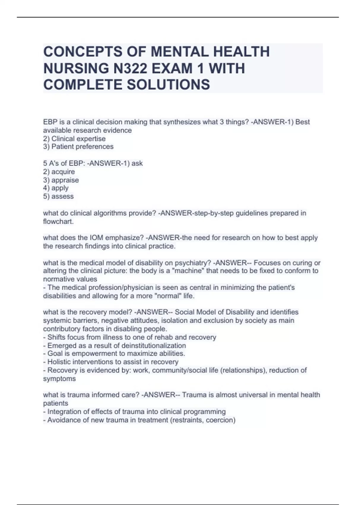 CONCEPTS OF MENTAL HEALTH NURSING N322 EXAM 1 WITH COMPLETE SOLUTIONSCONCEPTS OF MENTAL HEALTH NURSING N322 EXAM 1 WITH COMPLETE SOLUTIONSCONCEPTS OF MENTAL HEALTH NURSING N322 EXAM 1 WITH COMPLETE SOLUTIONS EBP is a clinical decision making that synthesizes what 3 things? -ANSWER-1) Best available research evidence 2) Clinical expertise 3) Patient preferences 5 A's of EBP: -ANSWER-1) ask 2) acquire 3) appraise 4) apply 5) assess what do clinical algorithms provide? -ANSWER-step-by-step guidelines prepared in flowchart. what does the IOM emphasize? -ANSWER-the need for research on how to best apply the research findings into clinical practice. what is the medical model of disability on psychiatry? -ANSWER-- Focuses on curing or altering the clinical picture: the body is a "machine" that needs to be fixed to conform to normative values - The medical profession/physician is seen as central in minimizing the patient's disabilities and allowing for a more "normal" life. what is the recovery model? -ANSWER-- Social Model of Disability and identifies systemic barriers, negative attitudes, isolation and exclusion by society as main contributory factors in disabling people. - Shifts focus from illness to one of rehab and recovery - Emerged as a result of deinstitutionalization - Goal is empowerment to maximize abilities. - Holistic interventions to assist in recovery - Recovery is evidenced by: work, community/social life (relationships), reduction of symptoms what is trauma informed care? -ANSWER-- Trauma is almost universal in mental health