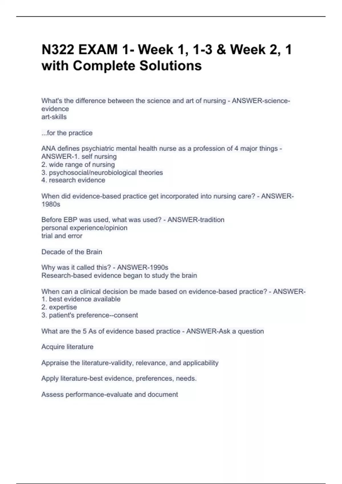 N322 EXAM 1- Week 1, 1-3 & Week 2, 1 with Complete SolutionsN322 EXAM 1- Week 1, 1-3 & Week 2, 1 with Complete SolutionsN322 EXAM 1- Week 1, 1-3 & Week 2, 1 with Complete SolutionsWhat's the difference between the science and art of nursing - ANSWER-science-evidence art-skills ...for the practice ANA defines psychiatric mental health nurse as a profession of 4 major things - ANSWER-1. self nursing 2. wide range of nursing 3. psychosocial/neurobiological theories 4. research evidence When did evidence-based practice get incorporated into nursing care? - ANSWER-1980s Before EBP was used, what was used? - ANSWER-tradition personal experience/opinion trial and error Decade of the Brain Why was it called this? - ANSWER-1990s Research-based evidence began to study the brain When can a clinical decision be made based on evidence-based practice? - ANSWER-1. best evidence available 2. expertise 3. patient's preference--consent What are the 5 As of evidence based practice - ANSWER-Ask a question Acquire literature Appraise the literature-validity, relevance, and applicability