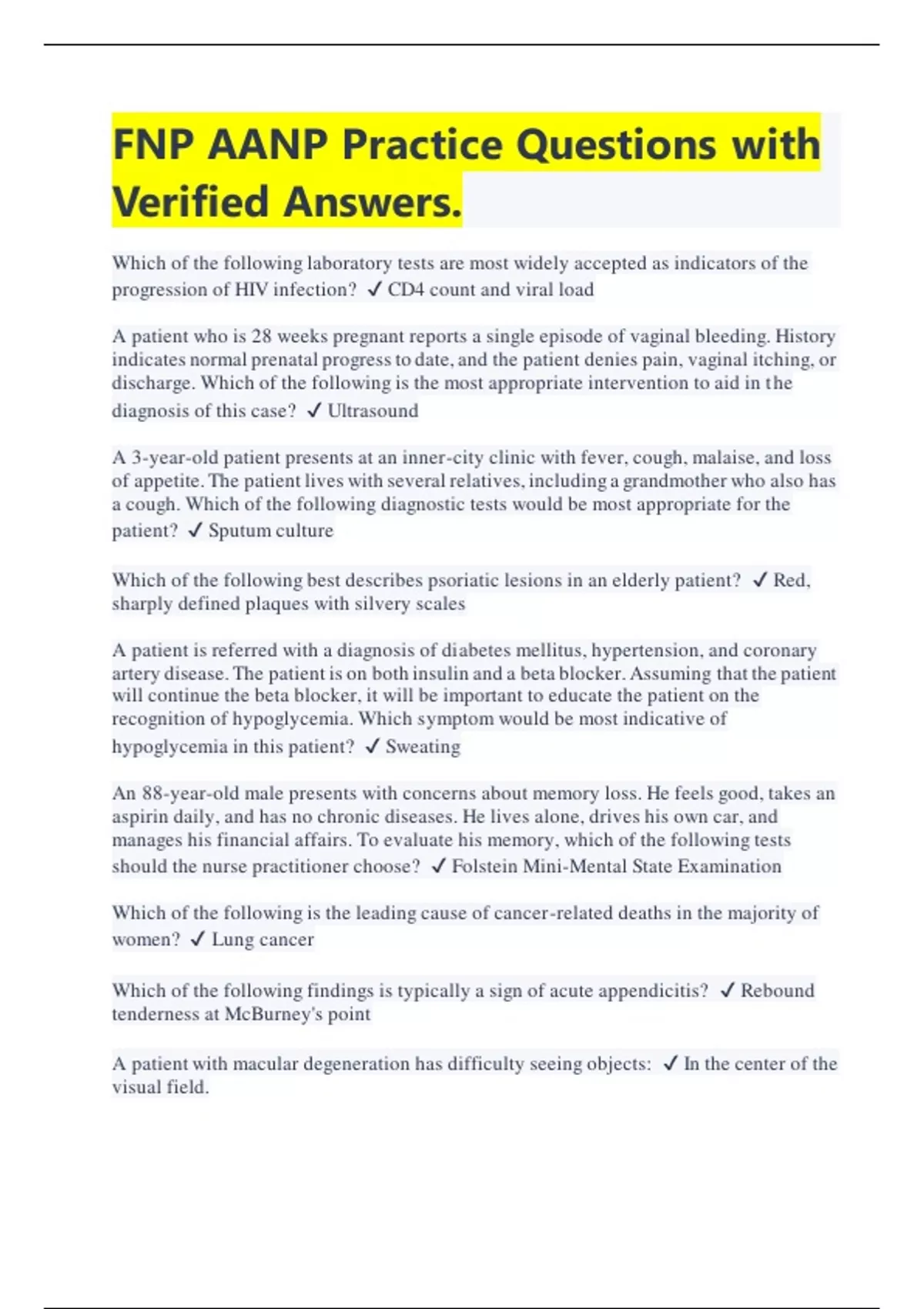 FNP AANP Practice Questions with Verified Answers | Latest 2023/2024 Which of the following laboratory tests are most widely accepted as indicators of the progression of HIV infection? CD4 count and viral load A patient who is 28 weeks pregnant reports a single episode of vaginal bleeding. History indicates normal prenatal progress to date, and the patient denies pain, vaginal itching, or discharge. Which of the following is the most appropriate intervention to aid in the diagnosis of this case? Ultrasound A 3-year-old patient presents at an inner-city clinic with fever, cough, malaise, and loss of appetite. The patient lives with several relatives, including a grandmother who also has a cough. Which of the following diagnostic tests would be most appropriate for the patient? Sputum culture Which of the following best describes psoriatic lesions in an elderly patient? Red, sharply defined plaques with silvery scales A patient is referred with a diagnosis of diabetes mellitus, hypertension, and coronary artery disease. The patient is on both insulin and a beta blocker. Assuming that the patient will continue the beta blocker, it will be important to educate the patient on the recognition of hypoglycemia. Which symptom would be most indicative of hypoglycemia in this patient? Sweating An 88-year-old male presents with concerns about memory loss. He feels good, takes an aspirin daily, and has no chronic diseases. He lives alone, drives his own car, and manages his financial affairs. To evaluate his memory, which of the following tests should the nurse practitioner choose? Folstein Mini-Mental State Examination Which of the following is the leading cause of cancer-related deaths in the majority of women? Lung cancer Which of the following findings is typically a sign of acute appendicitis? Rebound tenderness at McBurney's point A patient with macular degeneration has difficulty seeing objects: In the center of the visual field.