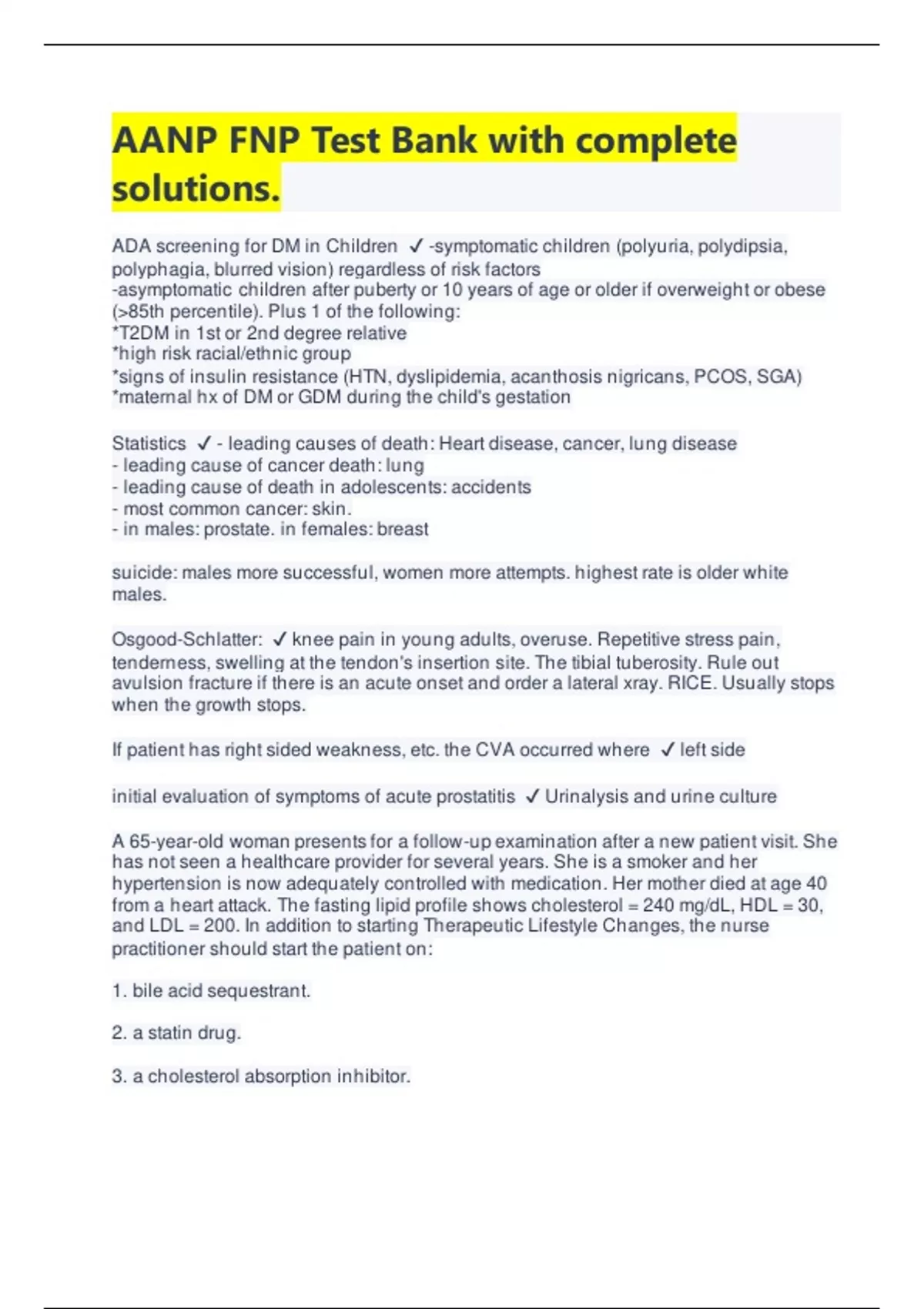AANP FNP Test Bank with complete solutions| Latest 2023/2024 ADA screening for DM in Children -symptomatic children (polyuria, polydipsia, polyphagia, blurred vision) regardless of risk factors -asymptomatic children after puberty or 10 years of age or older if overweight or obese (>85th percentile). Plus 1 of the following: *T2DM in 1st or 2nd degree relative *high risk racial/ethnic group *signs of insulin resistance (HTN, dyslipidemia, acanthosis nigricans, PCOS, SGA) *maternal hx of DM or GDM during the child's gestation Statistics - leading causes of death: Heart disease, cancer, lung disease - leading cause of cancer death: lung - leading cause of death in adolescents: accidents - most common cancer: skin. - in males: prostate. in females: breast suicide: males more successful, women more attempts. highest rate is older white males. Osgood-Schlatter: knee pain in young adults, overuse. Repetitive stress pain, tenderness, swelling at the tendon's insertion site. The tibial tuberosity. Rule out avulsion fracture if there is an acute onset and order a lateral xray. RICE. Usually stops when the growth stops. If patient has right sided weakness, etc. the CVA occurred where left side initial evaluation of symptoms of acute prostatitis Urinalysis and urine culture A 65-year-old woman presents for a follow-up examination after a new patient visit. She has not seen a healthcare provider for several years. She is a smoker and her hypertension is now adequately controlled with medication. Her mother died at age 40 from a heart attack. The fasting lipid profile shows cholesterol = 240 mg/dL, HDL = 30, and LDL = 200. In addition to starting Therapeutic Lifestyle Changes, the nurse practitioner should start the patient on: 1. bile acid sequestrant. 2. a statin drug. 3. a cholesterol absorption inhibitor.