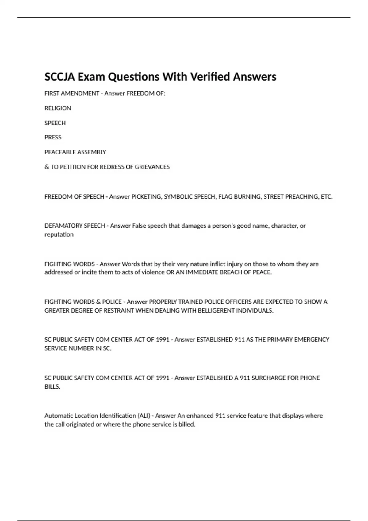 FIRST AMENDMENT - Answer FREEDOM OF: RELIGION SPEECH PRESS PEACEABLE ASSEMBLY & TO PETITION FOR REDRESS OF GRIEVANCES FREEDOM OF SPEECH - Answer PICKETING, SYMBOLIC SPEECH, FLAG BURNING, STREET PREACHING, ETC. DEFAMATORY SPEECH - Answer False speech that damages a person's good name, character, or reputation FIGHTING WORDS - Answer Words that by their very nature inflict injury on those to whom they are addressed or incite them to acts of violence OR AN IMMEDIATE BREACH OF PEACE. FIGHTING WORDS & POLICE - Answer PROPERLY TRAINED POLICE OFFICERS ARE EXPECTED TO SHOW A GREATER DEGREE OF RESTRAINT WHEN DEALING WITH BELLIGERENT INDIVIDUALS. SC PUBLIC SAFETY COM CENTER ACT OF 1991 - Answer ESTABLISHED 911 AS THE PRIMARY EMERGENCY SERVICE NUMBER IN SC. SC PUBLIC SAFETY COM CENTER ACT OF 1991 - Answer ESTABLISHED A 911 SURCHARGE FOR PHONE BILLS. Automatic Location Identification (ALI) - Answer An enhanced 911 service feature that displays where the call originated or where the phone service is billed. SC PUBLIC SAFETY COM CENTER ACT OF 1991 - ADDRESSING - Answer ASSIGNED A NUMERICAL ADDRESS AND STREET NAME TO ALL LOCATIONS INA JURISDICTION. Automatic Number Identification (ANI) - Answer An enhanced 911 service feature that shows the calling party's phone number on the display screen at the telecommunicator's terminal. CMRS - Answer COMMERCIAL MOBILE RADIO SERVICE - CELL PHONES Public Safety Answering Point (PSAP) - Answer Any location or facility at which 9-1-1 calls are answered either by direct calling, rerouting, or diversion. PUBLIC SAFETY AGENT - Answer FUNCTIONAL AGENCY THAT PROVIDES FIRE, EMS, OR LAW ENFORCEMENT SVCS. 80% - Answer PERCENTAGE OF LINES THAT MUST BE ANSWERED WITHIN 10 SECONDS PER SC LAW. 2 LINES - Answer MINIMUM NUMBER OF LINES A PSAP MUST HAVE. 60 DAYS - Answer MINIMUM NUMBER OF DAYS A PSAP MUST SAVE RECORDINGS. 1 LINE - Answer MINIMUM NUMBER OF LINES THAT MUST HAVE TTY OR TDD PER SC LAW. IMMEDIATE PLAYBACK - Answer RECORDINGS MUST HAVE... SC PUBLIC SAFETY COM CENTER ACT OF 1991 - Answer THIS ACT ESTABLISHED MINIMUM GUIDELINES FOR 911 CENTERS IN SC. SC PUBLIC SAFETY COM CENTER ACT OF 1991 - Answer TELCOMS MUST BE CERTIFIED BY THE LAW ENFORCEMENT TRAINING COUNCIL SC PUBLIC SAFETY COM CENTER ACT OF 1991 - Answer PSAPS MUST HAVE NON EMERGENCY LINES AS WELL SC PUBLIC SAFETY COM CENTER ACT OF 1991 - Answer COIN FREE DIALING REQUIREMENT SC PUBLIC SAFETY COM CENTER ACT OF 1991 - Answer SECONDARY BACK UP NUMBER FOR EMERGENCY CALLS SC PUBLIC SAFETY COM CENTER ACT OF 1991 - Answer PUBLIC EDUCATION AND OUTREACH. $200 - Answer FINE FOR NOT HAVING 3 INCH NUMBERS ON YOUR HOUSE OR AT THE STREET, IF THE HOUSE IS MORE THAN 50 FEET FROM THE ROAD. DUPLICATE ADDRESSES - Answer EXISTING STREET NAMES WHICH ARE THE SAME IN A JURISDICTION NEED TO BE CHANGED IF THEY HAVE THE SAME ADDRESS BECAUSE SC PUBLIC SAFETY COM CENTER ACT OF 1991 DOES NOT ALLOW - SC PUBLIC SAFETY COM CENTER ACT OF 1991 - Answer NEW STREET NAMES MAY NOT DUPLICATE EXISTING ONES IN THE SAME JURISDICTION. SC ETHICS REFORM ACT OF 1991 - Answer PUBLIC EMPLOYEES CAN'T RECEIVE ANYTHING OF VALUE ANYTHING OF VALUE - Answer MONEY, BANK BILL, PROMISSORY NOTE ART, ANTIQUE, AUTOMOBILE PROMISE OF EMPLOYMENT TITLE TO REAL ESTATE ANYTHING OF VALUE DOES NOT MEAN - Answer PROMOTIONAL ITEMS LESS THAN $10. A TROPHY OR PLAQUE LESS THAN $150. ANYTHING OF VALUE DOES NOT MEAN - Answer EDUCATIONAL MATERIAL DIRECTLY RELATED TO THE OFFICIAL'S RESPONSIBILITIES ANYTHING OF VALUE DOES NOT MEAN - Answer HONORARY DEGREE ANYTHING OF VALUE DOES NOT MEAN - Answer PROMOTIONAL ITEMS GIVEN TO THE OFFICIAL ON THE SAME TERMS THEY ARE GIVEN TO THE GENERAL PUBLIC. ANYTHING OF VALUE DOES NOT MEAN - Answer CAMPAIGN CONTRIBUTIONS THAT ARE PROPERLY DISCLOSED. FCC REGULATIONS - Answer TELECOMMUNICATORS ARE NOT REQUIRED TO HAVE AN FCC RADIO LICENSE. FCC REGULATIONS - GENERAL BROADCASTING PROCEDURES - Answer TRANSMISSIONS SHOULD BE BROADCAST WITH MINIMAL TRANSMISSION TIME. FCC REGULATIONS - GENERAL BROADCASTING PROCEDURES - Answer LICENSES CAN BE SUSPENDED FOR: 1. USING PROFANE LANGUAGE 2. SENDING FALSE OR DECEPTIVE INFO. 3. USING A FALSE CALL SIGN. 4. WILLFULLY INTERFERING WITH OTHER RADIO SIGNALS. 5. UNPROFESSIONAL RADIO DEMEANOR. NCIC 2000 FUNCTIONALITY - Answer COMPUTERIZED INFORMATION SYSTEM THAT PROVIDES ACCESS TO: 1. WANTED PERSON INFORMATION 2. MISSING PERSON INFORMATION 3. UNIDENTIFIED PERSON INFORMATION 4. STOLEN PROPERTY INFORMATION 5. CRIMINAL HISTORY INFORMATION 6. INFORMATION FROM CRIMINAL INVESTIGATIONS OF CRIMES THAT ARE KNOWN OR REASONABLY BELIEVED TO HAVE OCCURRED. NCIC 2000 SECURITY - Answer GENERALLY LIMITED TO CRIMINAL JUSTICE PURPOSES. NCIC 2000 - Answer National Crime Information Center 2000, Federal Bureau of investigation; Clarksburg, West Virginia NCIC 2000 SECURITY - Answer MUST FOLLOW AN APPROVED DESIGN: 1. PHYSICAL SECURITY. 2. PASSWORD SECURITY. 3. ENCRYPTION 4. APPROVED FIREWALLS NCIC 2000 SECURITY - Answer SYSTEM MUST BE SAFEGUARDED FROM ALL THREATS AND UNAUTHORIZED ACCESS. TELECOMMUNICATORS DUTY OF CARE - Answer 1. ****SPECIAL RELATIONSHIP TO THE VICTIM**** 2. SPECIAL RELATIONSHIP TO THE INJURER. 3. ****VOLUNTARY UNDERTAKING**** 4. CREATION OF RISK. 5. STATUTORY IMPOSITION OF DUTY. ****VOLUNTARY UNDERTAKING**** - Answer PUBLIC SERVICE IS CONSIDERED A VOLUNTARY OCCUPATION. ****SPECIAL RELATIONSHIP TO THE VICTIM**** - Answer THE FORMATION OF A SHORT-TERM WORKING RELATIONSHIP BETWEEN TELCOM AND CALLER. REASONS FOR A CIVIL LAWSUIT - Answer NEGLIGENCE WILLFUL MISCONDUCT 42 U.S.C. 1983 NEGLIGENCE - Answer LEGAL DUTY TO THE PLAINTIFF BREACH OF THAT DUTY PLAINTIFF SUFFERED DAMAGES DEFENDANT'S CONDUCT CAUSED THE DAMAGES WILLFUL MISCONDUCT OR INTENTIONAL TORT - Answer WHEN THE TELCOM WILLFULLY AND DELIBERATELY CAUSES INJURY OR BREACHES HIS OR HER DUTY. 42 U.S.C. 1983 - Answer RELATING TO FEDERAL CIVIL RIGHTS. TELCOM CAN BE SUED IF: 1. THE PLAINTIFF WAS DEPRIVED BY A FEDERALLY PROTECTED CIVIL RIGHT. 2. THE TELCOM ACTED UNDER THE COLOR OF LAW. TWO CATEGO