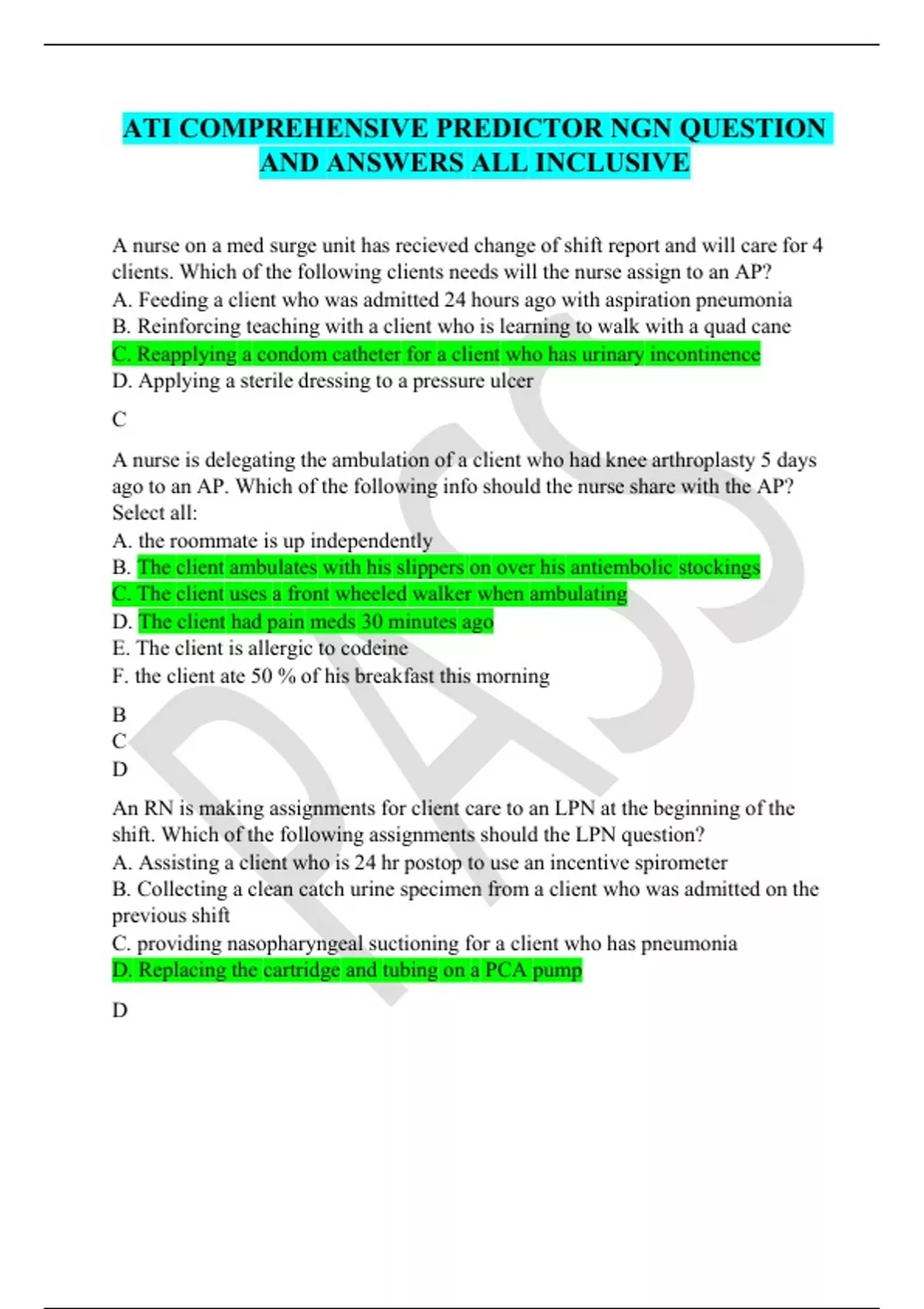 ATI COMPREHENSIVE PREDICTOR NGN QUESTION AND ANSWERS ALL INCLUSIVE A nurse on a med surge unit has recieved change of shift report and will care for 4 clients. Which of the following clients needs will the nurse assign to an AP? A.Feeding a client who was admitted 24 hours ago with aspiration pneumonia B.Reinforcing teaching with a client who is learning to walk with a quad cane C. Reapplying a condom catheter for a client who has urinary incontinence D. Applying a sterile dressing to a pressure ulcer C A nurse is delegating the ambulation of a client who had knee arthroplasty 5 days ago to an AP. Which of the following info should the nurse share with the AP? Select all: A.the roommate is up independently B.The client ambulates with his slippers on over his antiembolic stockings C. The client uses a front wheeled walker when ambulating D.The client had pain meds 30 minutes ago E.The client is allergic to codeine F.the client ate 50 % of his breakfast this morning B C D An RN is making assignments for client care to an LPN at the beginning of the shift. Which of the following assignments should the LPN question? A.Assisting a client who is 24 hr postop to use an incentive spirometer B.Collecting a clean catch urine specimen from a client who was admitted on the previous shift C.providing nasopharyngeal suctioning for a client who has pneumonia D. Replacing the cartridge and tubing on a PCA pump D A nurse is preparing an inservice program about delegation. Which of the following elements should she identify when presenting the 5 rights of delegation. Select all: A.Right client B.Right supervision/evaluation C. Right direction/communication D. Right time