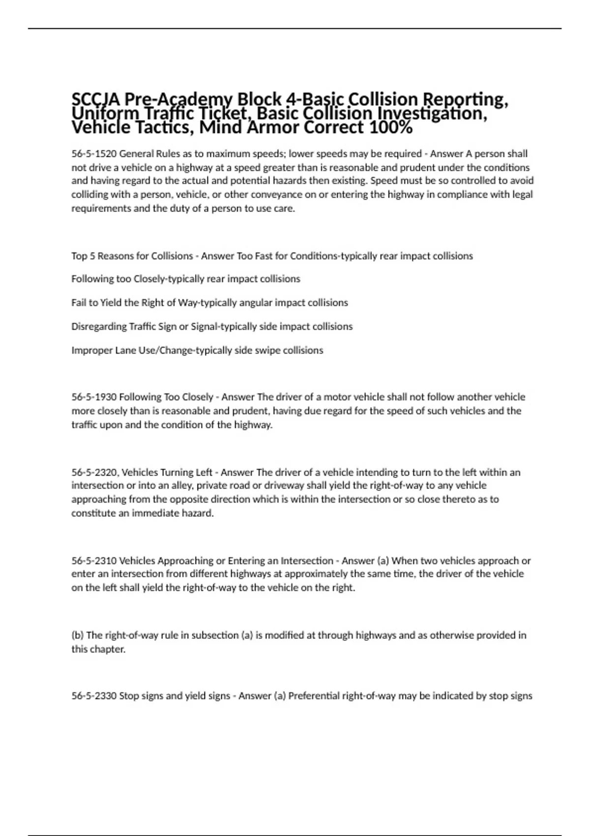 SCCJA Pre-Academy Block 4-Basic Collision Reporting, Uniform Traffic Ticket, Basic Collision Investigation, Vehicle Tactics, Mind Armor Correct 100%