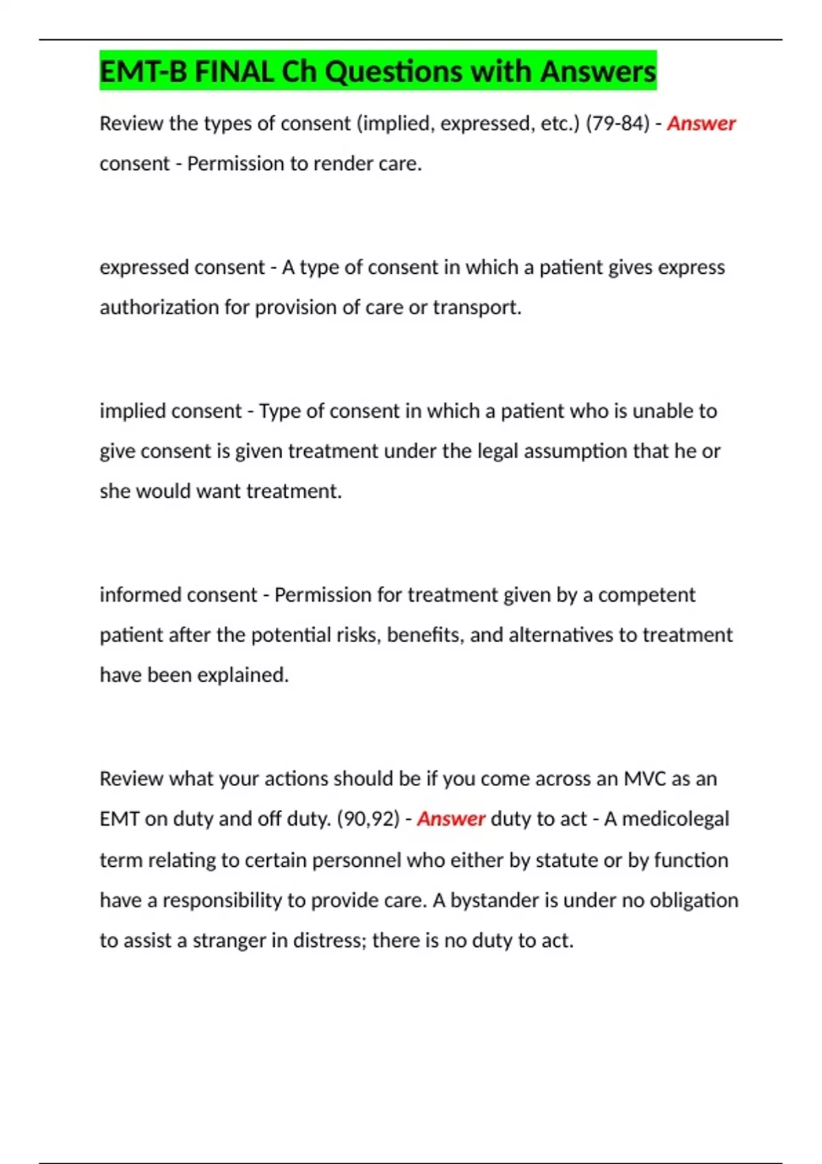 EMT-B FINAL Ch Questions with Answers