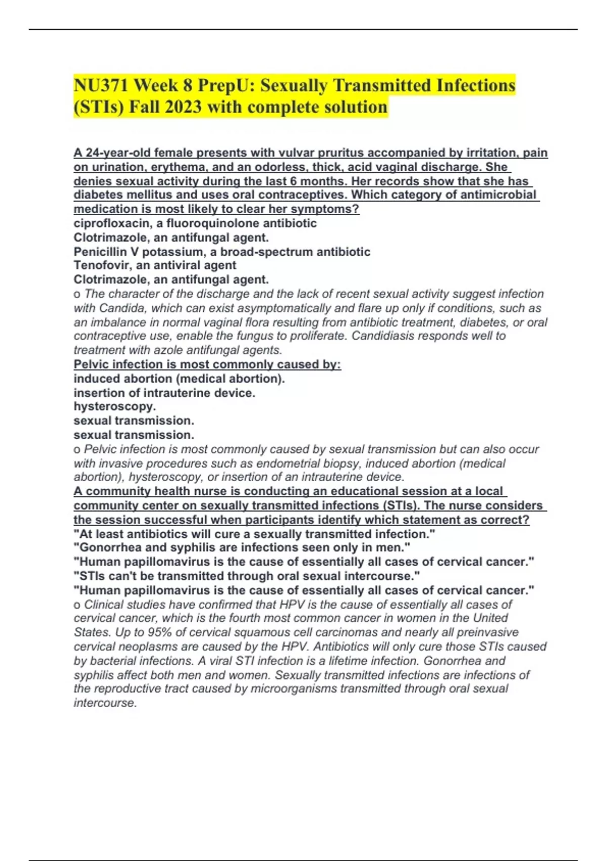 NU371 Week 8 PrepU: Sexually Transmitted Infections (STIs) Fall 2023 with complete solution A 24-year-old female presents with vulvar pruritus accompanied by irritation, pain on urination, erythema, and an odorless, thick, acid vaginal discharge. She denies sexual activity during the last 6 months. Her records show that she has diabetes mellitus and uses oral contraceptives. Which category of antimicrobial medication is most likely to clear her symptoms? ciprofloxacin, a fluoroquinolone antibiotic Clotrimazole, an antifungal agent. Penicillin V potassium, a broad-spectrum antibiotic Tenofovir, an antiviral agent Clotrimazole, an antifungal agent. o The character of the discharge and the lack of recent sexual activity suggest infection with Candida, which can exist asymptomatically and flare up only if conditions, such as an imbalance in normal vaginal flora resulting from antibiotic treatment, diabetes, or oral contraceptive use, enable the fungus to proliferate. Candidiasis responds well to treatment with azole antifungal agents. Pelvic infection is most commonly caused by: induced abortion (medical abortion). insertion of intrauterine device. hysteroscopy. sexual transmission. sexual transmission. o Pelvic infection is most commonly caused by sexual transmission but can also occur with invasive procedures such as endometrial biopsy, induced abortion (medical abortion), hysteroscopy, or insertion of an intrauterine device. A community health nurse is conducting an educational session at a local community center on sexually transmitted infections (STIs). The nurse considers the session successful when participants identify which statement as correct? "At least antibiotics will cure a sexually transmitted infection." "Gonorrhea and syphilis are infections seen only in men." "Human papillomavirus is the cause of essentially all cases of cervical cancer." "STIs can't be transmitted through oral sexual intercourse." "Human papillomavirus is the cause of essentially all cases of cervical cancer." o Clinical studies have confirmed that HPV is the cause of essentially all cases of cervical cancer, which is the fourth most common cancer in women in the United States. Up to 95% of cervical squamous cell carcinomas and nearly all preinvasive cervical neoplasms are caused by the HPV. Antibiotics will only cure those STIs caused by bacterial infections. A viral STI infection is a lifetime infection. Gonorrhea and syphilis affect both men and women. Sexually transmitted infections are infections of the reproductive tract caused by microorganisms transmitted through oral sexual intercourse. For a woman, what i