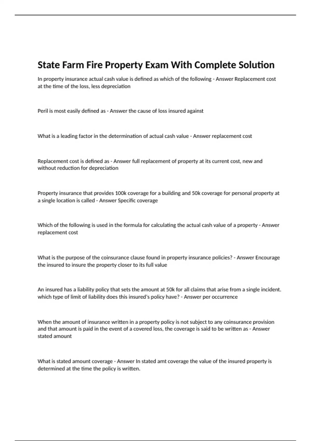 In property insurance actual cash value is defined as which of the following - Answer Replacement cost at the time of the loss, less depreciation Peril is most easily defined as - Answer the cause of loss insured against What is a leading factor in the determination of actual cash value - Answer replacement cost Replacement cost is defined as - Answer full replacement of property at its current cost, new and without reduction for depreciation Property insurance that provides 100k coverage for a building and 50k coverage for personal property at a single location is called - Answer Specific coverage Which of the following is used in the formula for calculating the actual cash value of a property - Answer replacement cost What is the purpose of the coinsurance clause found in property insurance policies? - Answer Encourage the insured to insure the property closer to its full value An insured has a liability policy that sets the amount at 50k for all claims that arise from a single incident. which type of limit of liability does this insured's policy have? - Answer per occurrence When the amount of insurance written in a property policy is not subject to any coinsurance provision and that amount is paid in the event of a covered loss, the coverage is said to be written as - Answer stated amount