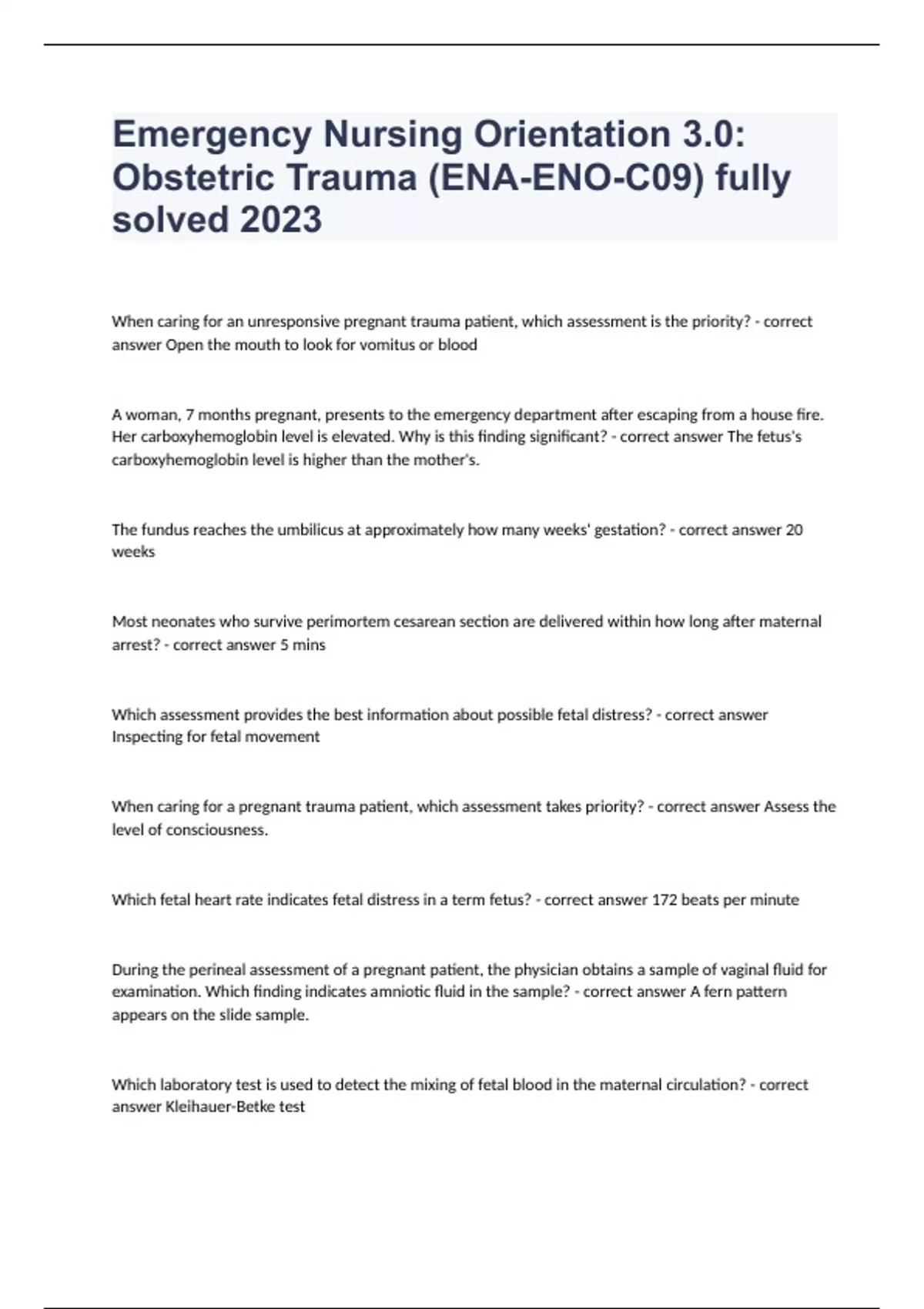 Emergency Nursing Orientation 3.0: Obstetric Trauma (ENA-ENO-C09) fully solved 2023When caring for an unresponsive pregnant trauma patient, which assessment is the priority? - correct answer Open the mouth to look for vomitus or blood A woman, 7 months pregnant, presents to the emergency department after escaping from a house fire. Her carboxyhemoglobin level is elevated. Why is this finding significant? - correct answer The fetus's carboxyhemoglobin level is higher than the mother's. The fundus reaches the umbilicus at approximately how many weeks' gestation? - correct answer 20 weeks Most neonates who survive perimortem cesarean section are delivered within how long after maternal arrest? - correct answer 5 mins Which assessment provides the best information about possible fetal distress? - correct answer Inspecting for fetal movement When caring for a pregnant trauma patient, which assessment takes priority? - correct answer Assess the level of consciousness. Which fetal heart rate indicates fetal distress in a term fetus? - correct answer 172 beats per minute During the perineal assessment of a pregnant patient, the physician obtains a sample of vaginal fluid for examination. Which finding indicates amniotic fluid in the sample? - correct answer A fern pattern appears on the slide sample. Which laboratory test is used to detect the mixing of fetal blood in the maternal circulation? - correct answer Kleihauer-Betke test
