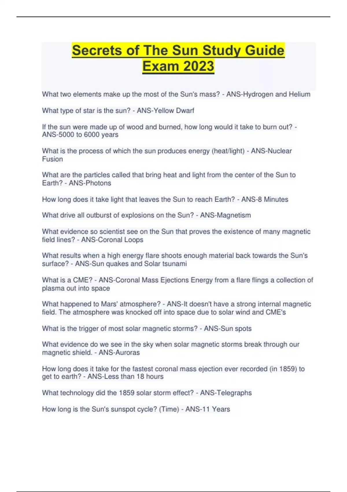Secrets of The Sun Study Guide Exam 2023 What two elements make up the most of the Sun's mass? - ANS-Hydrogen and Helium What type of star is the sun? - ANS-Yellow Dwarf If the sun were made up of wood and burned, how long would it take to burn out? - ANS-5000 to 6000 years What is the process of which the sun produces energy (heat/light) - ANS-Nuclear Fusion What are the particles called that bring heat and light from the center of the Sun to Earth? - ANS-Photons How long does it take light that leaves the Sun to reach Earth? - ANS-8 Minutes What drive all outburst of explosions on the Sun? - ANS-Magnetism What evidence so scientist see on the Sun that proves the existence of many magnetic field lines? - ANS-Coronal Loops What results when a high energy flare shoots enough material back towards the Sun's surface? - ANS-Sun quakes and Solar tsunami What is a CME? - ANS-Coronal Mass Ejections Energy from a flare flings a collection of plasma out into space What happened to Mars' atmosphere? - ANS-It doesn't have a strong internal magnetic field. The atmosphere was knocked off into space due to solar wind and CME's What is the trigger of most solar magnetic storms? - ANS-Sun spots What evidence do we see in the sky when solar magnetic storms break through our magnetic shield. - ANS-Auroras How long does it take for the fastest coronal mass ejection ever recorded (in 1859) to get to earth? - ANS-Less than 18 hours What technology did the 1859 solar storm effect? - ANS-Telegraphs How long is the Sun's sunspot cycle? (Time) - ANS-11 Years Continues...