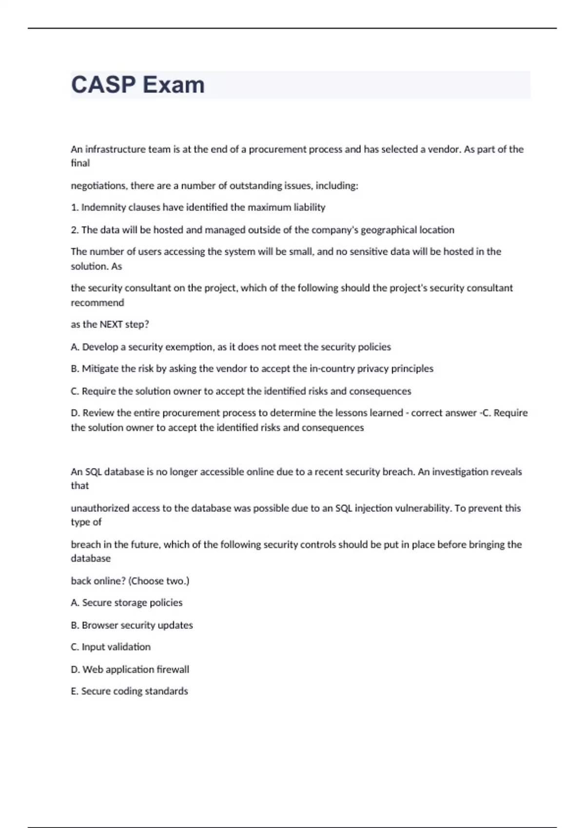 An infrastructure team is at the end of a procurement process and has selected a vendor. As part of the final negotiations, there are a number of outstanding issues, including: 1. Indemnity clauses have identified the maximum liability 2. The data will be hosted and managed outside of the company's geographical location The number of users accessing the system will be small, and no sensitive data will be hosted in the solution. As the security consultant on the project, which of the following should the project's security consultant recommend as the NEXT step? A. Develop a security exemption, as it does not meet the security policies B. Mitigate the risk by asking the vendor to accept the in-country privacy principles C. Require the solution owner to accept the identified risks and consequences D. Review the entire procurement process to determine the lessons learned C. Require the solution owner to accept the identified risks and consequences An SQL database is no longer accessible online due to a recent security breach. An investigation reveals that unauthorized access to the database was possible due to an SQL injection vulnerability. To prevent this type of breach in the future, which of the following security controls should be put in place before bringing the database back online? (Choose two.) A. Secure storage policies B. Browser security updates C. Input validation D. Web application firewall E. Secure coding standards F. Database activity monitoring C. Input validation F. Database activity monitoring