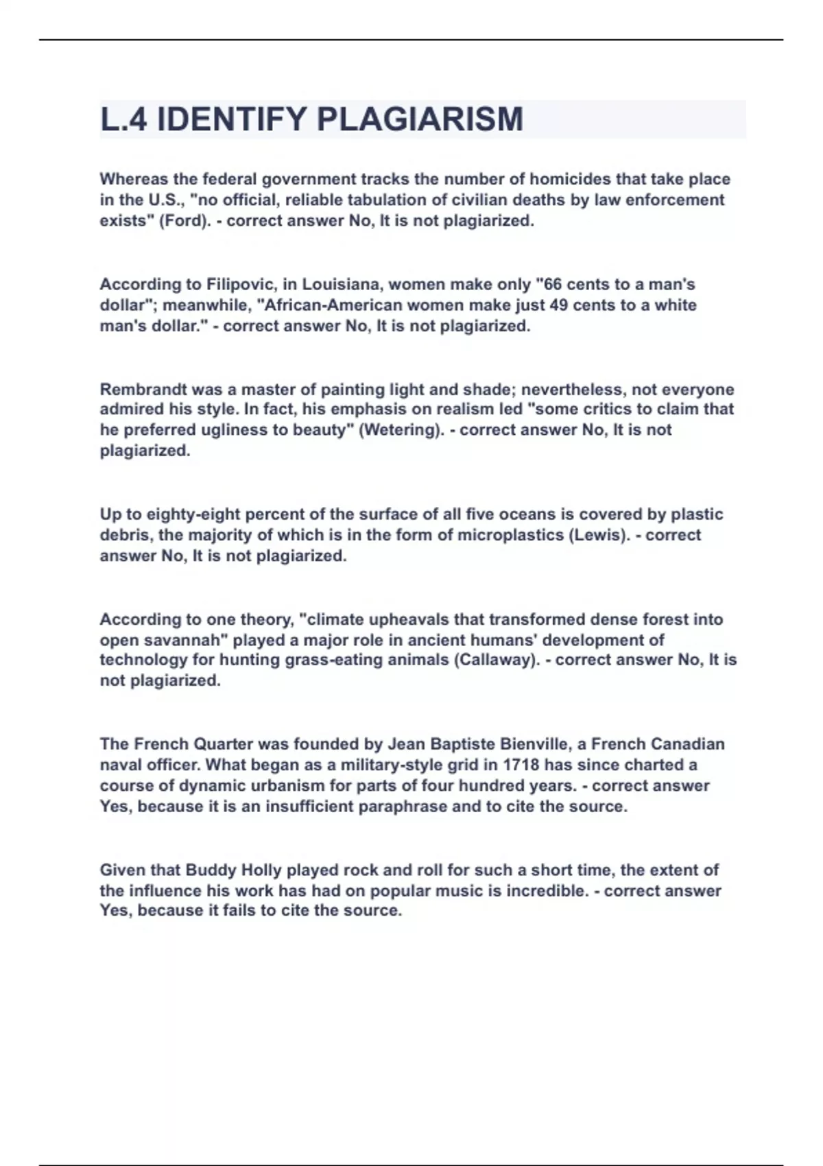 Whereas the federal government tracks the number of homicides that take place in the U.S., "no official, reliable tabulation of civilian deaths by law enforcement exists" (Ford). No, It is not plagiarized. According to Filipovic, in Louisiana, women make only "66 cents to a man's dollar"; meanwhile, "African-American women make just 49 cents to a white man's dollar." No, It is not plagiarized. Rembrandt was a master of painting light and shade; nevertheless, not everyone admired his style. In fact, his emphasis on realism led "some critics to claim that he preferred ugliness to beauty" (Wetering). No, It is not plagiarized. Up to eighty-eight percent of the surface of all five oceans is covered by plastic debris, the majority of which is in the form of microplastics (Lewis). No, It is not plagiarized. According to one theory, "climate upheavals that transformed dense forest into open savannah" played a major role in ancient humans' development of technology for hunting grass-eating animals (Callaway). No, It is not plagiarized. The French Quarter was founded by Jean Baptiste Bienville, a French Canadian naval officer. What began as a military-style grid in 1718 has since charted a course of dynamic urbanism for parts of four hundred years. Yes, because it is an insufficient paraphrase and to cite the source. Given that Buddy Holly played rock and roll for such a short time, the extent of the influence his work has had on popular music is incredible. Yes, because it fails to cite the source. According to Pritchett, composer John Cage thought of percussion as a way to introduce sounds that more accurately reflected the nature of the industrial culture he witnessed around him. Yes, because it fails to use quotation marks. Zebras, which "have evolved superb early-warning mechanisms, such as peripheral vision far superior to other horses'," are adept at evading predators. Yes, because it fails to cite the source. Stories of UFO sightings may be most common in Illinois, which is a "hotbed of extra-terrestrial speculation, with six of the 10 most widely-spotted UFO events" (Cromidas). No, It is not plagiarized. Pacific Chorus Frog tadpoles have developed an interesting defense against predators such as the predaceous diving beetle: their tails become enlarged to distract strikes from the body of the tadpole toward the tail, which is less vulnerable (Benard). Yes, because it fails to use quotation marks. It has been said that the new technologies of the digital era have yielded great headlines, but modest economic results. Yes, because it fails to use quotation marks and fails to cite the source. The two-million-year-old remains of Homo habilis, "a meat-eating creature with a larger brain who used crude stone tools," were discovered around Olduvai Gorge (Lonely Planet). No, it is not plagiarized. Hummingbirds metabolize their food extremely quickly. If humans had a similar metabolism, they would need to ingest about 155,000 calories a day (San Diego Zoo). No, It is not plagiarized. Punch cards caught on in computing thanks largely to Herman Hollerith, who developed a system using Jacquard's punched cards to help compute data for the 1890 census (Kopplin). No, It is not plagiarized.