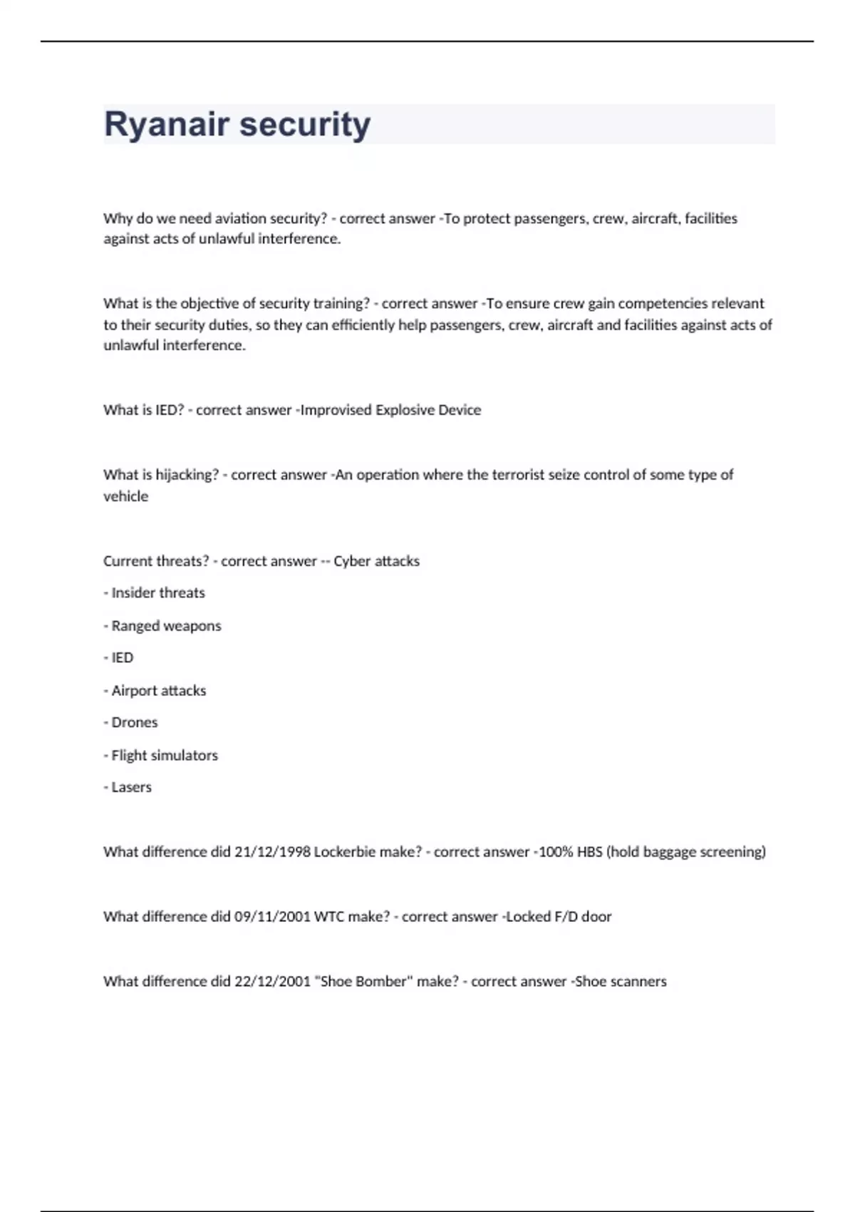 Why do we need aviation security? To protect passengers, crew, aircraft, facilities against acts of unlawful interference. What is the objective of security training? To ensure crew gain competencies relevant to their security duties, so they can efficiently help passengers, crew, aircraft and facilities against acts of unlawful interference. What is IED? Improvised Explosive Device What is hijacking? An operation where the terrorist seize control of some type of vehicle Current threats? - Cyber attacks - Insider threats - Ranged weapons - IED - Airport attacks - Drones - Flight simulators - Lasers What difference did 21/12/1998 Lockerbie make? 100% HBS (hold baggage screening) What difference did 09/11/2001 WTC make? Locked F/D door What difference did 22/12/2001 "Shoe Bomber" make? Shoe scanners What difference did 24/08/2006 Liquid explosives plot make? Restrictions on liquids Robust security culture is based on: - Effective security procedures - Strong reporting culture - Vigilance among stuff - Good quality of security training - Feeling of ownership among all employees
