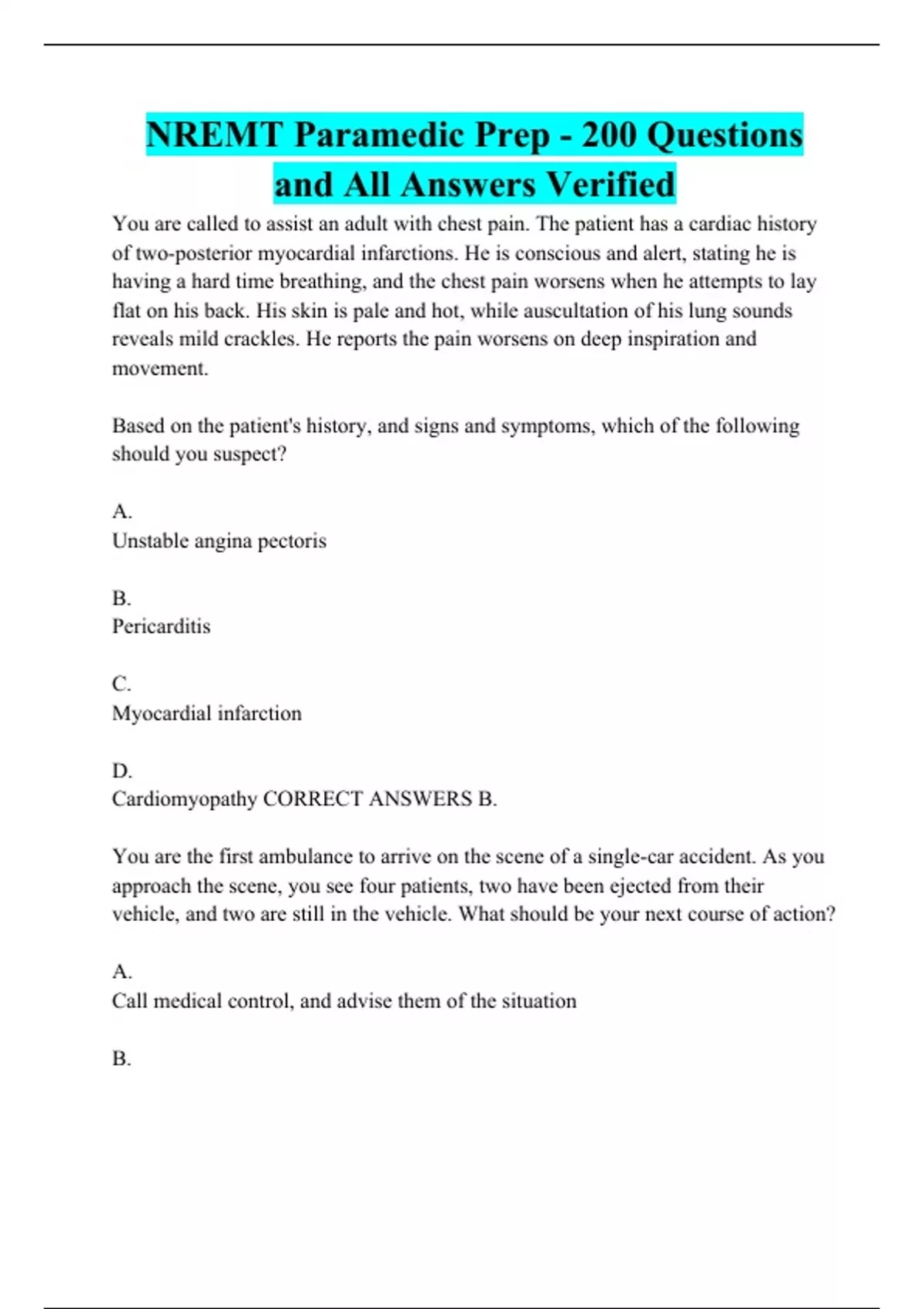 NREMT Paramedic Prep - 200 Questions and All Answers Verified