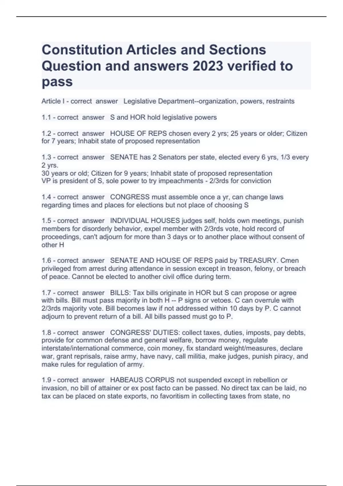 Constitution Articles and Sections Question and answers 2023 verified to pass Article I - correct answer Legislative Department--organization, powers, restraints 1.1 - correct answer S and HOR hold legislative powers 1.2 - correct answer HOUSE OF REPS chosen every 2 yrs; 25 years or older; Citizen for 7 years; Inhabit state of proposed representation 1.3 - correct answer SENATE has 2 Senators per state, elected every 6 yrs, 1/3 every 2 yrs. 30 years or old; Citizen for 9 years; Inhabit state of proposed representation VP is president of S, sole power to try impeachments - 2/3rds for conviction