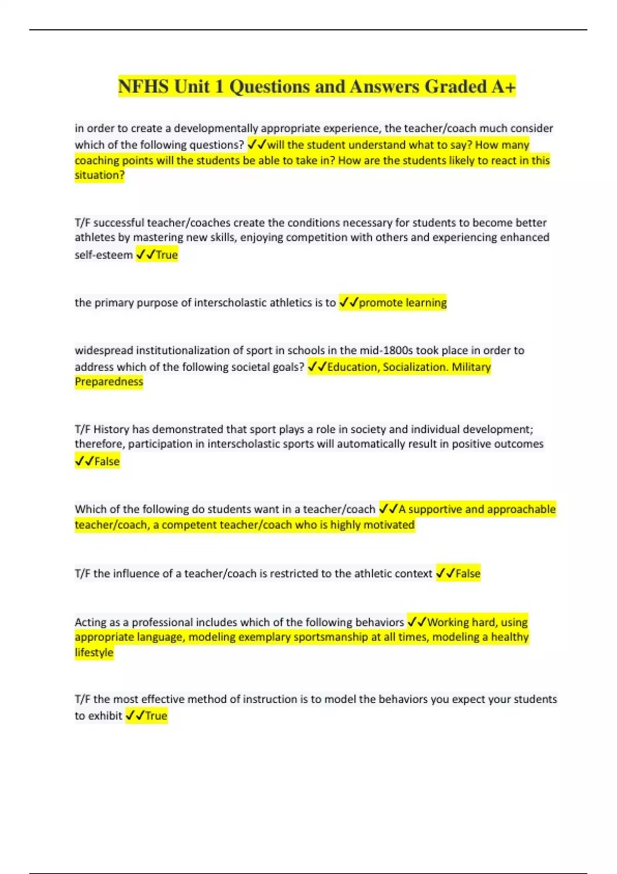 NFHS Unit 1 Questions and Answers Graded A+ in order to create a developmentally appropriate experience, the teacher/coach much consider which of the following questions? will the student understand what to say? How many coaching points will the students be able to take in? How are the students likely to react in this situation? T/F successful teacher/coaches create the conditions necessary for students to become better athletes by mastering new skills, enjoying competition with others and experiencing enhanced self-esteem True the primary purpose of interscholastic athletics is to promote learning widespread institutionalization of sport in schools in the mid-1800s took place in order to address which of the following societal goals? Education, Socialization. Military Preparedness T/F History has demonstrated that sport plays a role in society and individual development; therefore, participation in interscholastic sports will automatically result in positive outcomes False Which of the following do students want in a teacher/coach A supportive and approachable teacher/coach, a competent teacher/coach who is highly motivated T/F the influence of a teacher/coach is restricted to the athletic context False Acting as a professional includes which of the following behaviors Working hard, using appropriate language, modeling exemplary sportsmanship at all times, modeling a healthy lifestyle T/F the most effective method of instruction is to model the behaviors you expect your students to exhibit True