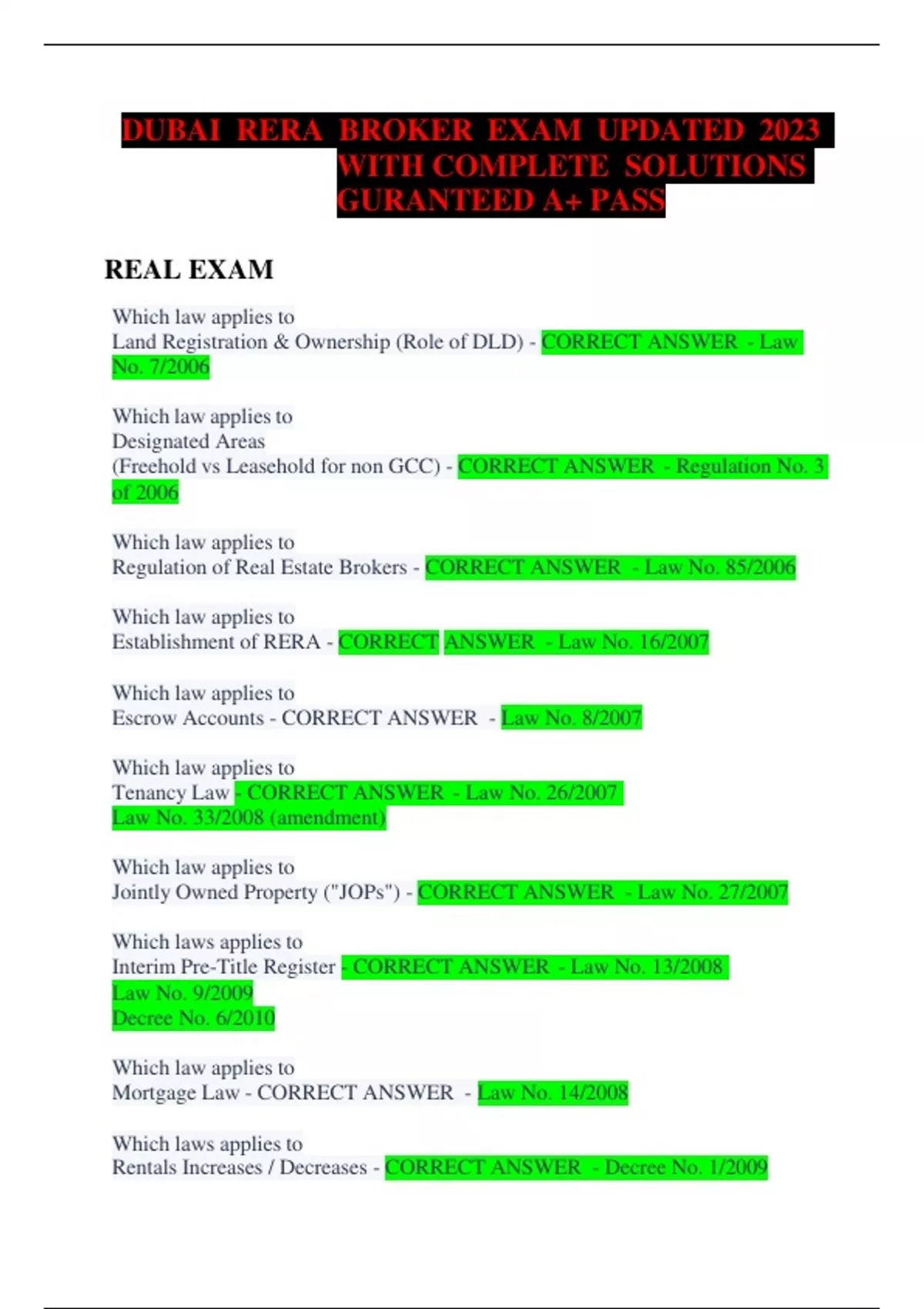 DUBAI RERA BROKER EXAM UPDATED 2023 WITH COMPLETE SOLUTIONS GURANTEED A+ PASS REAL EXAM Which law applies to Land Registration & Ownership (Role of DLD) - CORRECT ANSWER - Law No. 7/2006 Which law applies to Designated Areas (Freehold vs Leasehold for non GCC) - CORRECT ANSWER - Regulation No. 3 of 2006 Which law applies to Regulation of Real Estate Brokers - CORRECT ANSWER - Law No. 85/2006 Which law applies to Establishment of RERA - CORRECT ANSWER - Law No. 16/2007 Which law applies to Escrow Accounts - CORRECT ANSWER - Law No. 8/2007 Which law applies to Tenancy Law - CORRECT ANSWER - Law No. 26/2007 Law No. 33/2008 (amendment) Which law applies to Jointly Owned Property ("JOPs") - CORRECT ANSWER - Law No. 27/2007 Which laws applies to Interim Pre-Title Register - CORRECT ANSWER - Law No. 13/2008 Law No. 9/2009 Decree No. 6/2010 Which law applies to Mortgage Law - CORRECT ANSWER - Law No. 14/2008 Which laws applies to Rentals Increases / Decreases - CORRECT ANSWER - Decree No. 1/2009 Decree No. 2/2001 What does a transaction that is concluded contrary to Law 7 of 2006 result in? - CORRECT ANSWER - A Breach of the Criminal Code, which could lead to prosecution and professional sanctions. Structure of the Dubai Real Estate Legal System - CORRECT ANSWER - 1. Institutions 2. Registries 3. Laws Real Property Register - CORRECT ANSWER - "A set of documents held in written or electronic format in the electronic register at the Department, which point out the description and location of Real Property and the rights attached hereto". Sale of an off-plan unit must be registered... - CORRECT ANSWER - ...in the Interim Real Estate Register Project Registration with RERA includes - CORRECT ANSWER - 1. Plans of the unit 2. Apartment numbers 3. Internal and external size 4. Common area plans Class A Brokers - CORRECT ANSWER - Exempt of taking the test Class B Brokers - CORRECT ANSWER - Must take a RERA DREI Test EJARI System - CORRECT ANSWER - System that records all rental agreements Who must register a rental agreement? - CORRECT ANSWER - The landlord Who pays for registering the rental agreement? - CORRECT ANSWER - The tenant Who's name is a project's trust account created - CORRECT ANSWER - The project