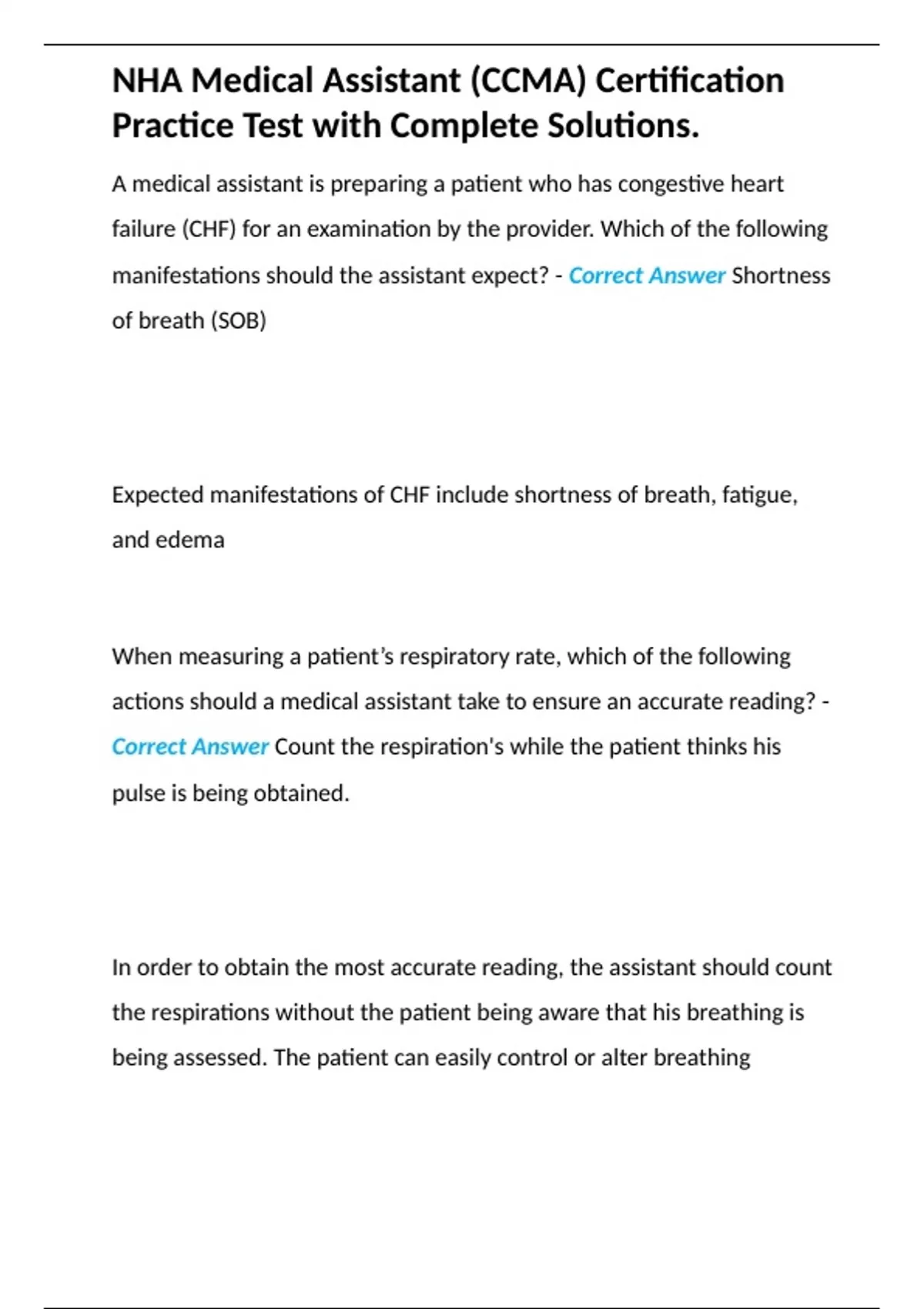 NHA Medical Assistant (CCMA) Certification Practice Test with Complete Solutions.