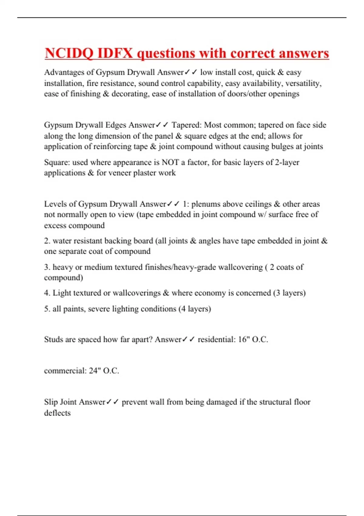 Advantages of Gypsum Drywall Answer low install cost, quick & easy installation, fire resistance, sound control capability, easy availability, versatility, ease of finishing & decorating, ease of installation of doors/other openings Gypsum Drywall Edges Answer Tapered: Most common; tapered on face side along the long dimension of the panel & square edges at the end; allows for application of reinforcing tape & joint compound without causing bulges at joints Square: used where appearance is NOT a factor, for basic layers of 2-layer applications & for veneer plaster work Levels of Gypsum Drywall Answer 1: plenums above ceilings & other areas not normally open to view (tape embedded in joint compound w/ surface free of excess compound 2. water resistant backing board (all joints & angles have tape embedded in joint & one separate coat of compound 3. heavy or medium textured finishes/heavy-grade wallcovering ( 2 coats of compound) 4. Light textured or wallcoverings & where economy is concerned (3 layers) 5. all paints, severe lighting conditions (4 layers) Studs are spaced how far apart? Answer residential: 16" O.C. commercial: 24" O.C. Slip Joint Answer prevent wall from being damaged if the structural floor deflects Plaster Construction Answer 1. Scratc